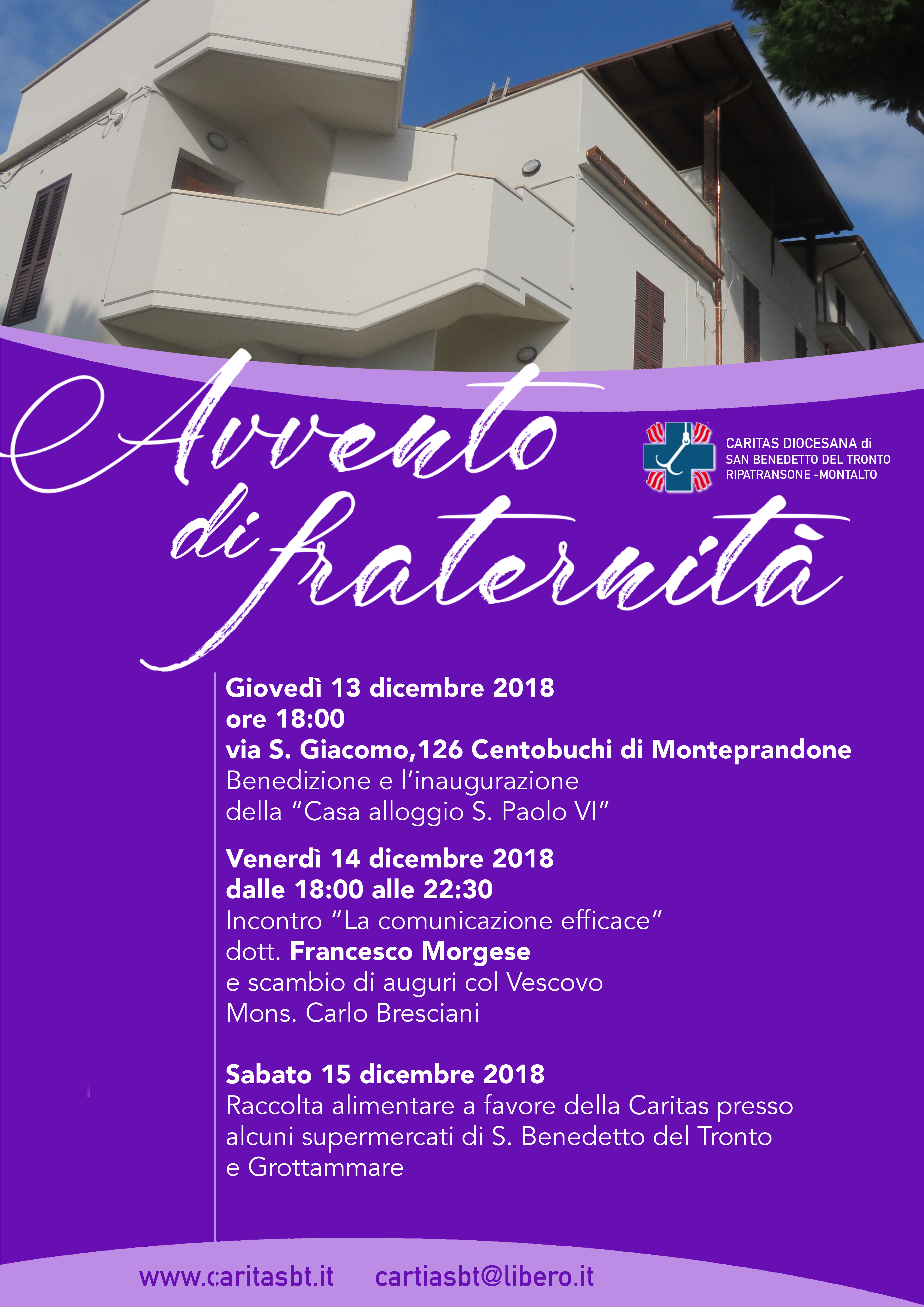 DIOCESI – La caritas diocesana comunica che: “per motivi tecnici l’inaugurazione della casa S. Paolo VI a Centobuchi di Monteprandone prevista per giovedì 13 dicembre 2018 sarà rimandata di qualche giorno”. Leggi qui