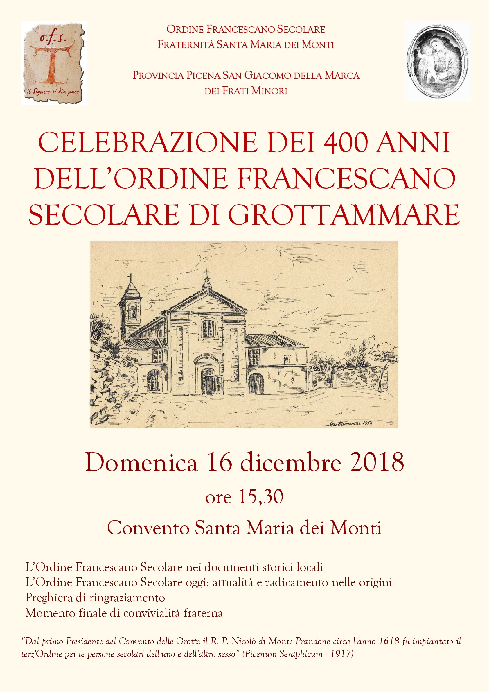 GROTTAMMARE – L’Ordine Francescano Secolare, la Fraternità di Santa Maria dei Monti e la Provincia Picena San Giacomo della Marca organizzano alle ore 15.30 di domenica 16 dicembre all’interno del Convento di Santa Maria dei Monti a Grottammare, la celebrazione dei 400 anni dell’Ordine Francescano secolare di Grottammare, già Terz’Ordine Francescano