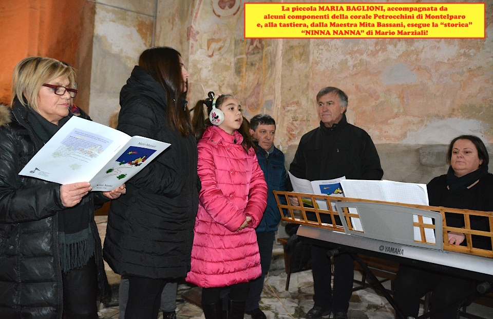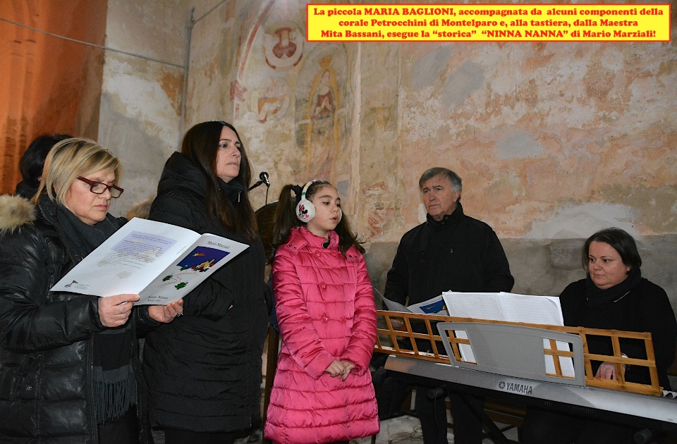 Per ricordare più concretamente l’indimenticato maestro Mario, il pomeriggio musicale vedeva l’esecuzione della Sua “Ninna Nanna” (parole del poeta locale Dante Tempestilli) preparata alla perfezione, e cantata quale solista, dalla piccola, bravissima Maria Baglioni. Maria era accompagnata da una parte della Corale Petrocchini di Montelparo con, alla tastiera, la disponibilissima Maestra Mita Bassani, direttrice della Corale Alaleona che, avvertita per tempo, era pronta per l’evenienza!