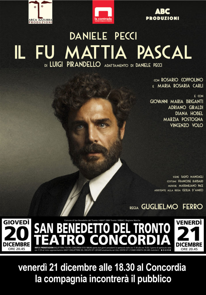 SAN BENEDETTO DEL TRONTO – Una nuova occasione per i sambenedettesi per conoscere da vicino i protagonisti del teatro italiano sarà offerta venerdì 21 dicembre alle 18,30 quando Daniele Pecci, protagonista de “Il fu Mattia Pascal” che andrà in scena il 21 e 22 dicembre al teatro Concordia, sarà a disposizione del pubblico nella stessa sala alle 18,30. L’incontro sarà moderato da Carlotta Tringali dell’AMAT.