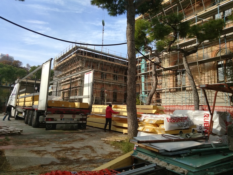 Come già riferito, la fase più rumorosa dei lavori, consistente nella demolizione del tetto, è terminata e, proprio ieri, sono arrivati i materiali per la ricostruzione del solaio che tornerà ad essere di legno, come all’epoca della costruzione originaria risalente ai primi anni del ‘900, per assicurare le necessarie garanzie antisismiche. I moduli sono stati depositati all’interno dell’area di cantiere allestita nel Parco delle Rimembranze in attesa dell’avvio della seconda fase dell’intervento.