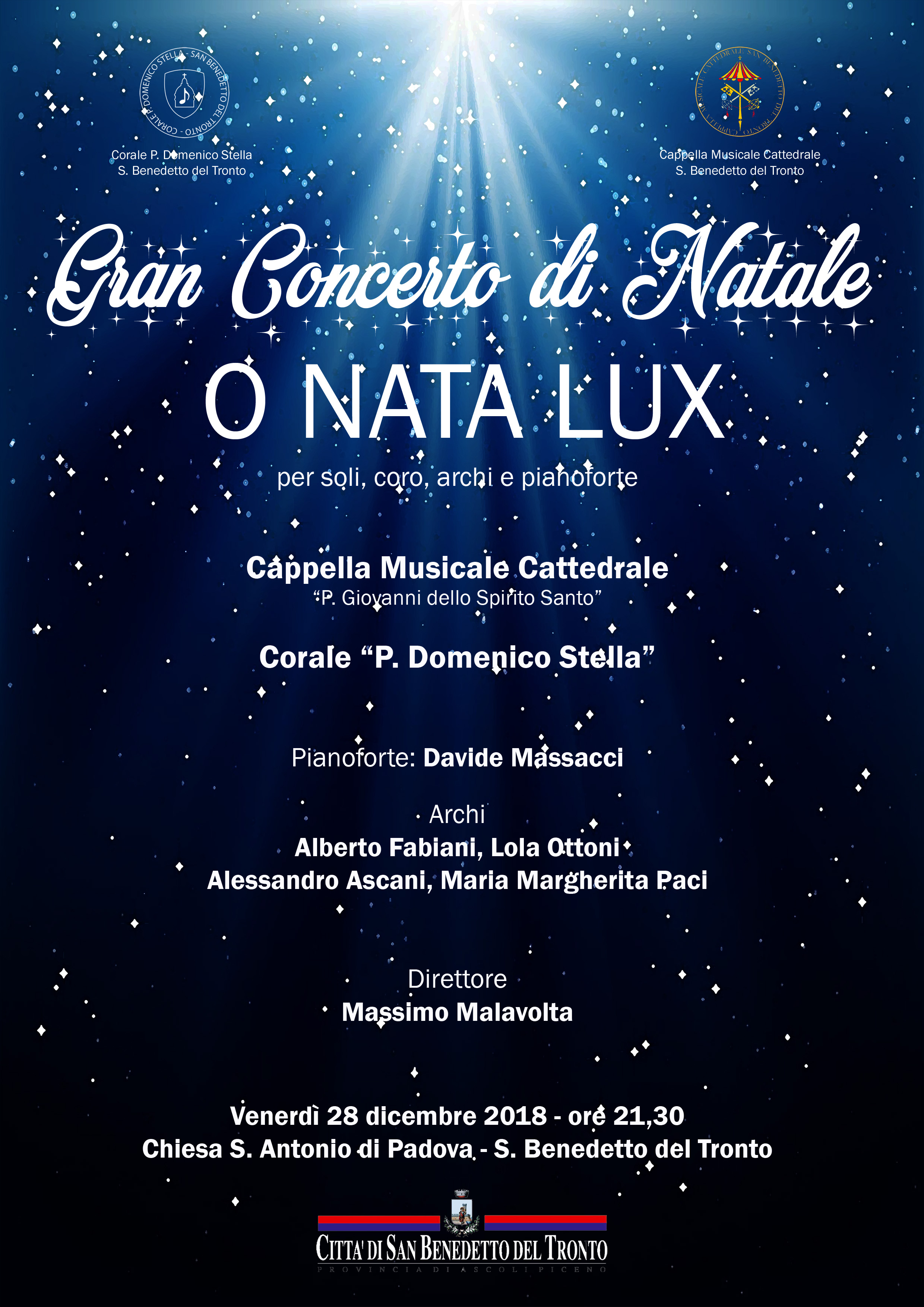 SAN BENEDETTO DEL TRONTO – Anche quest’anno la Cappella Musicale Cattedrale, Associazione Polifonica Corale “Padre Giovanni dello Spirito Santo”, in collaborazione con la “Corale Padre Domenico Stella” di S. Benedetto del Tronto offriranno a tutta la cittadinanza il Gran Concerto di Natale per Coro, Archi e pianoforte diretto dal M° Massimo Malavolta, venerdì 28 dicembre alle ore 21,30 presso la chiesa di S. Antonio di Padova a S. Benedetto del Tronto.