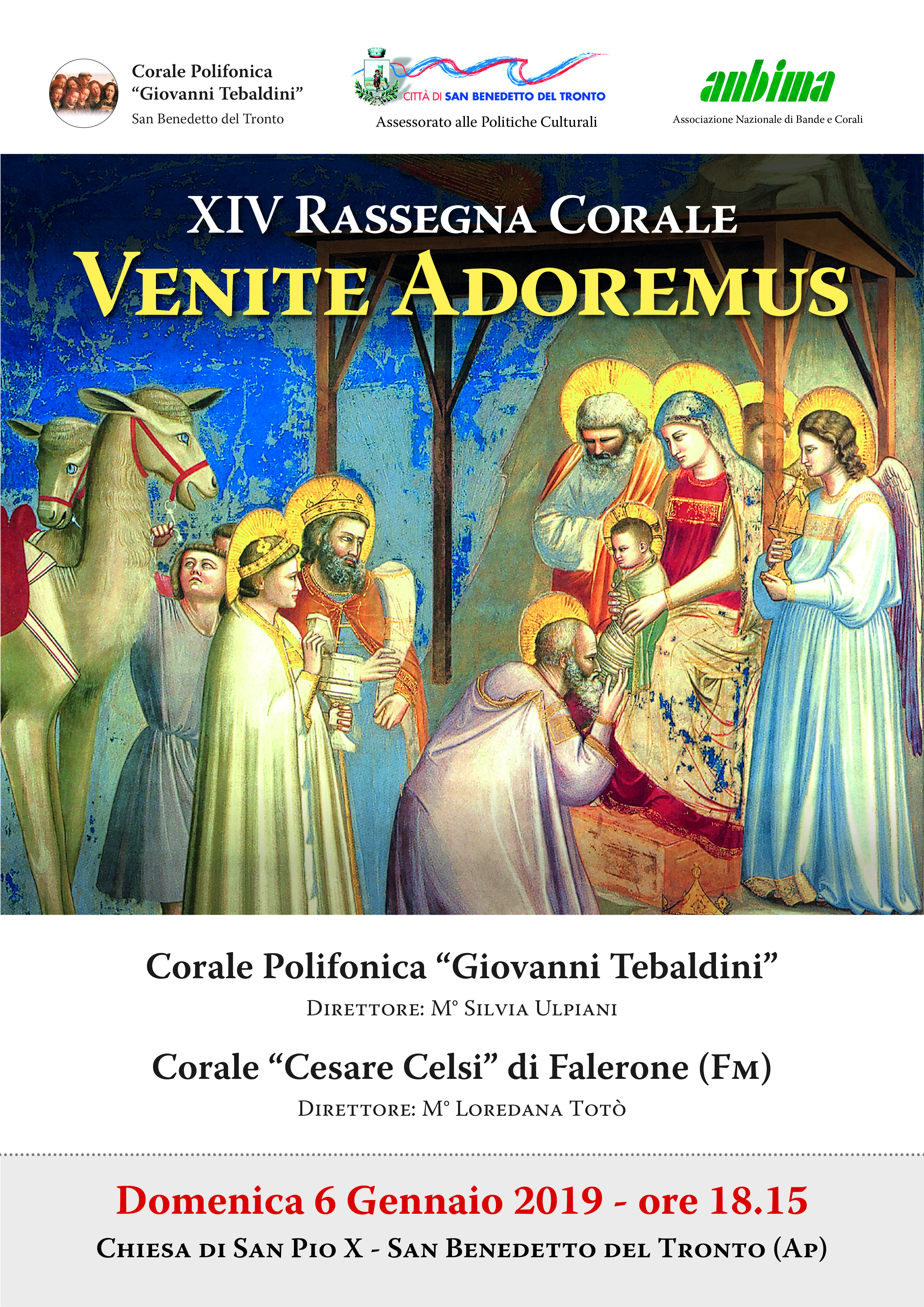 SAN BENEDETTO DEL TRONTO – Come è ormai tradizione, domenica 6 gennaio, alle 18.15, presso la chiesa parrocchiale di San Pio X a S. Benedetto del Tronto, torna la Rassegna Corale dell’Epifania “Venite adoremus”, giunta ormai alla XIV edizione, organizzata dalla Corale Polifonica Giovanni Tebaldini, diretta dal M° Guerrino Tamburrini e presieduta da Alceo Spinozzi. E’ una manifestazione sostenuta dall’Amministrazione comunale e posta a conclusione dei festeggiamenti natalizi programmati con “Città in Festa”.