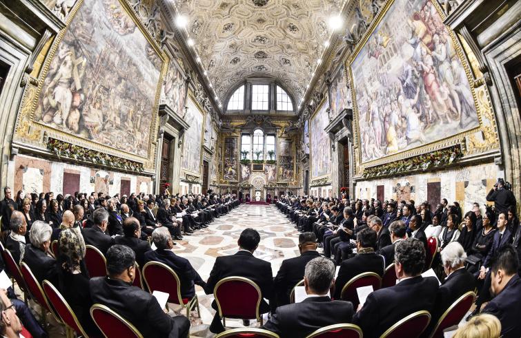 Populismi e nazionalismi: due “pulsioni” che hanno minato la Società delle Nazioni e che riappaiono oggi, indebolendo il multilateralismo da essa inaugurato un secolo fa e gettando la politica in una “crisi di credibilità”. È la lucida analisi che fa da sfondo al sesto discorso del Papa al Corpo diplomatico, durato più di un’ora e lungamente applaudito in Sala Regia. Punto di riferimento: il “memorabile discorso” di Paolo VI, primo Papa a prendere la parola all’Assemblea delle Nazioni Unite. Nella parte centrale del discorso, come nei precedenti, Francesco ha richiamato ancora una volta l’attenzione dei governi affinché si presti aiuto “a quanti sono dovuti emigrare a causa del flagello della povertà, di ogni genere di violenza e di persecuzione, come pure delle catastrofi naturali e degli sconvolgimenti climatici, e affinché si facilitino le misure che permettono la loro integrazione sociale nei Paesi di accoglienza”. Sono 183 gli Stati che attualmente intrattengono relazioni diplomatiche con la Santa Sede, cui vanno aggiunti l’Unione europea e il Sovrano Militare Ordine di Malta.