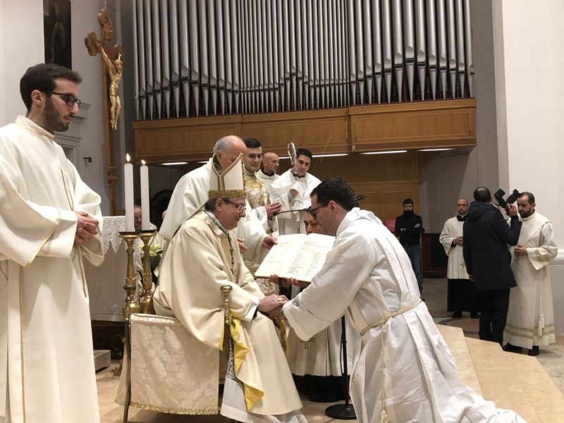 L’ordine del diaconato, che tra poco ti conferirò, non è solo una missione che Gesù ti affida, contiene anche una sua solenne promessa, proprio come quella che ha fatto ai suoi apostoli: “Andate dunque e ammaestrate tutte le nazioni, battezzandole nel nome del Padre e del Figlio e dello Spirito santo, insegnando loro ad osservare tutto ciò che vi ho comandato. Ecco, io sono con voi tutti i giorni, fino alla fine del mondo” (Mt 28, 19-20).