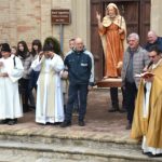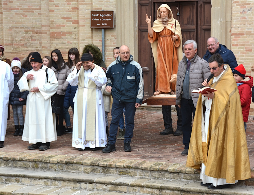 Alla fine si dipanava, per le vie del paese, una solenne processione con la statua del Santo che era preceduta dalla Banda di Castignano e seguita dai sacerdoti e da una lunga fila di fedeli. La processione aveva il suo epilogo, dopo averne salito la scalinata, davanti alla Chiesa di Sant’Agostino dove tutto, come la storia ci tramanda, aveva avuto inizio oltre trecento anni fa! Al suo interno non è stato possibile accedere perché essa è ancora irrimediabilmente chiusa per i guasti del sisma del 2016. Ultimo atto della cerimonia è stato quello in cui, Padre Agostino, ha impartito la benedizione ai presenti, agli animali e alle terre montelparesi.