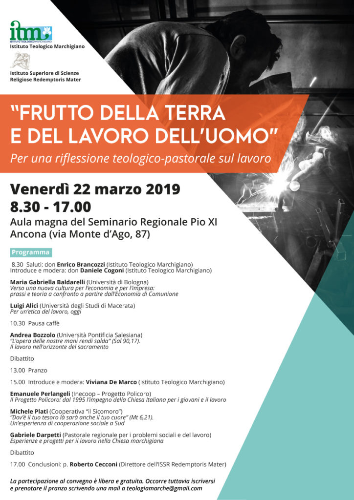 L’Istituto Teologico Marchigiano ospiterà il prossimo venerdì 22 marzo 2019 nella sede di Ancona una giornata di studio di teologia sacramentaria. Prendendo spunto dalle parole pronunciate a Genova lo scorso 27 maggio 2017 da papa Francesco ai lavoratori della città, si vorrebbe proporre una riflessione sulla teologia del lavoro e sulle implicazioni pratiche che interpellano il mondo credente: formazione, disoccupazione, precarietà, mercificazione, delocalizzazione, salari, impresa e profitto. Nel dire che il lavoro «è una priorità umana», papa Francesco sintetizza il senso della dottrina sociale della Chiesa in proposito. Se di per sé la tradizione ecclesiale ha un lungo e significativo insegnamento in proposito (si pensi al magistero di Paolo VI o a quello di Giovanni Paolo II), va anche osservato che non sempre la valenza positiva del lavoro è stata sottolineata adeguatamente. A volte l’orizzonte cristiano è stato risucchiato da una prospettiva esclusivamente immanente, mentre in altri casi è prevalsa per reazione una visione spiritualista e neo-gnostica, completamente avulsa dalle dinamiche del tempo presente. Il convegno vorrebbe raccogliere tali questioni e aprire uno spazio di riflessione sul carattere sacramentale del lavoro come collaborazione alla creazione.
