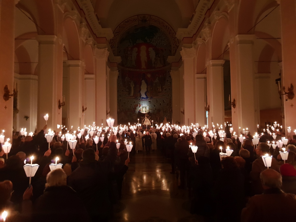 Al termine della celebrazione eucaristica l’immagine della Madonna, sulle note dell’ “Ave Maria di Lourdes”, trasportata in spalla, è stata portata in processione all’interno della Cattedrale, mentre i fedeli la tenevano in mano i caratteristici flambeaux.