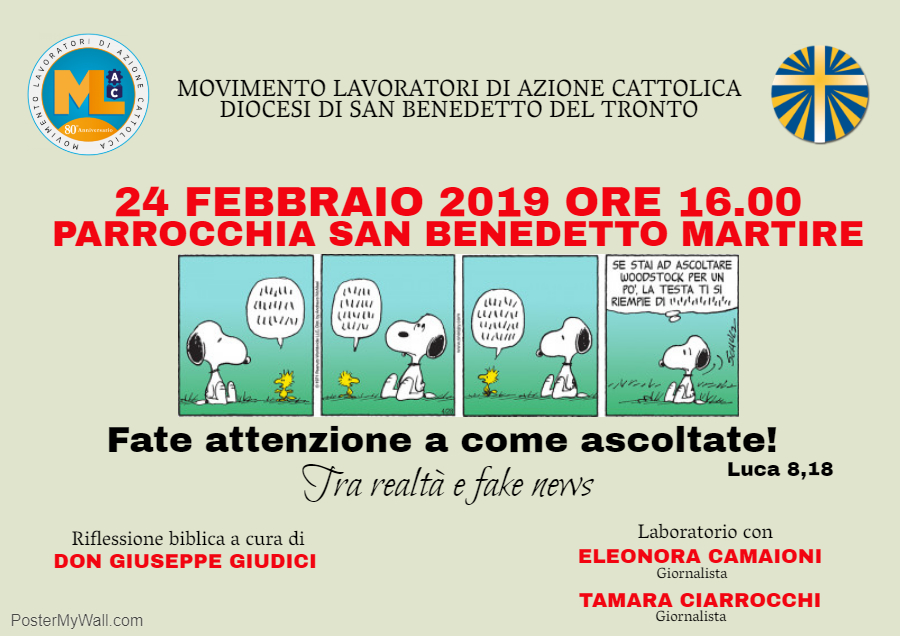 SAN BENEDETTO DEL TRONTO – Il Movimento Lavoratori di Azione Cattolica (MLAC) di S. Benedetto propone un’interessante iniziativa sui temi della comunicazione nell’era delle fake news. L’incontro si svolgerà il 24 febbraio presso il salone parrocchiale di S. Benedetto Martire al paese alto di S. Benedetto, dalle ore 16.00.