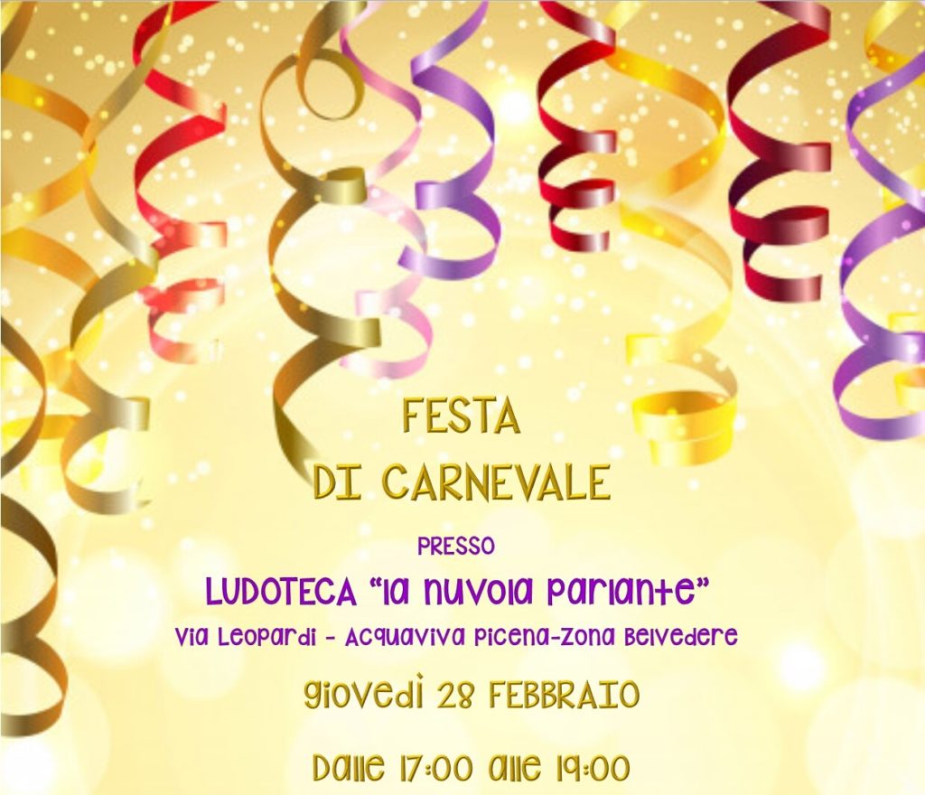 ACQUAVIVA PICENA – Giovedì 28 febbraio presso la ludoteca “La nuvola parlante” di Acquaviva Picena si svolgerà una festa di carnevale per i bambini dai tre ai tredici anni.