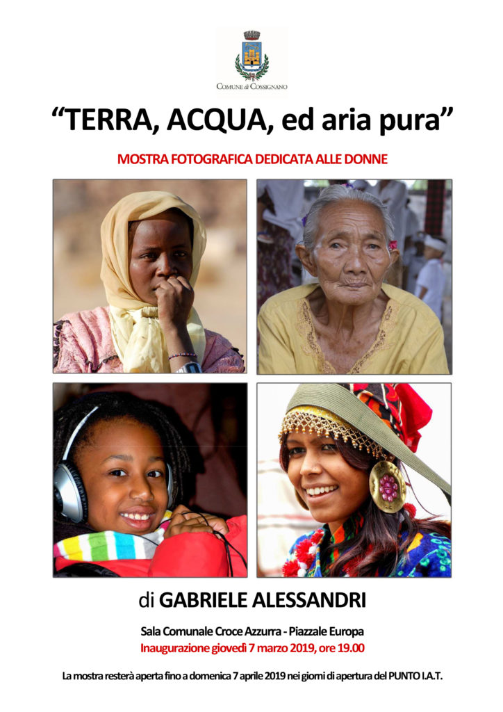 COSSIGNANO – Giovedì 7 marzo, alle ore 19.00, presso la Sala comunale della Croce Azzurra sita nel piazzale Europa di Cossignano, con il patrocinio del Comune di Cossignano verrà inaugurata la mostra fotografica “Terra, Aria, ed acqua pura” di Gabriele Alessandri. Trattasi di un omaggio a tutte le donne del mondo, quelle donne che credono fermamente nella femminilità come ricchezza, che usano le proprie doti come potenzialità per lasciare una traccia positiva ed incancellabile del loro passaggio nel mondo. Donna come figura fertile che dà vita e dà coraggio come la Terra, che nutre come l’Acqua.
