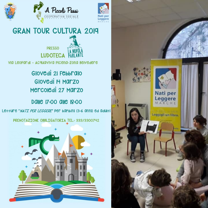 ACQUAVIVA PICENA – Il “Gran tour cultura” 2018/2019 è un evento voluto ed organizzato dall’Assessorato alla Cultura della Regione Marche, ormai alla sua VI edizione. Obiettivo dell’iniziative è quello di rendere gli istituti di cultura (biblioteche, musei, e altro) dei luoghi e dei palcoscenici che possano ospitare e promuovere eventi culturali di vario genere, attraverso differenti linguaggi collegati alla cultura in generale ed al patrimonio culturale di appartenenza, creando momenti di socializzazione ed integrazione, in spazi visti come luoghi accoglienti da vivere per l’occasione, in termini di incontro, dialogo, ma anche divertimento, creando allo stesso tempo atmosfere vivaci e cariche di emozioni. Il Comune di Acquaviva, sensibile ad iniziative di questo tipo e visto l’importante patrimonio storico e culturale dello stesso territorio, ha aderito promuovendo, presso la ludoteca “La nuvola parlante”, tre tappe del Gran tour cultura, grazie alla collaborazione della Cooperativa Sociale “ A piccoli passi” e dei volontari “Nati per leggere”.