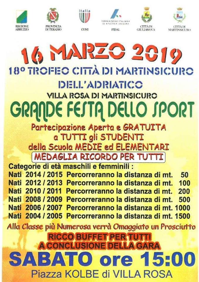 MARTINSICURO – Si svolgerà, nel corso del prossimo week-end, il 18° Trofeo “Città di Martinsicuro dell’Adriatico”, importante gara podistica organizzata dall’Associazione Sportiva dilettantistica “Ricci Sport” e “L’uomo Lepier”, con il patrocinio del comune truentino. Come da tradizione l’evento sportivo vivrà due distinti momenti: sabato 16 marzo si terrà la “Grande Festa dello Sport” con la mini maratonina aperta a tutti i bambini, con partenza dalle ore 15:00 in piazza Kolbe a Villa Rosa. Invece domenica 17 marzo si terrà la gara per gli adulti con la 18° edizione del Trofeo “Città di Martinsicuro dell’Adriatico”, ancora una volta con partenza da piazza Kolbe, ma alle ore 9:00.