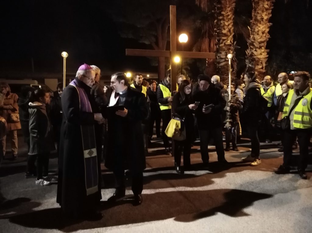 Don Francesco Ciabattoni della parrocchia Sacra Famiglia di Porto d’Ascoli ha introdotto la prima stazione quaresimale: “È importante fermarsi, sostare, stazionare per fare lode al Signore, per fare memoria di quanti hanno fatto testimonianza a Cristo. Fermarsi è importante ancora oggi, ci aiuta ad accogliere senza compromessi la Parola di Gesù. Davanti a questo luogo di sofferenza e servizio, dove ogni giorno vengono accolti e aiutati tanti fratelli bisognosi, rimaniamo in silenzio e in preghiera ripensando a quali sono le cose importanti, le cose di Dio.”