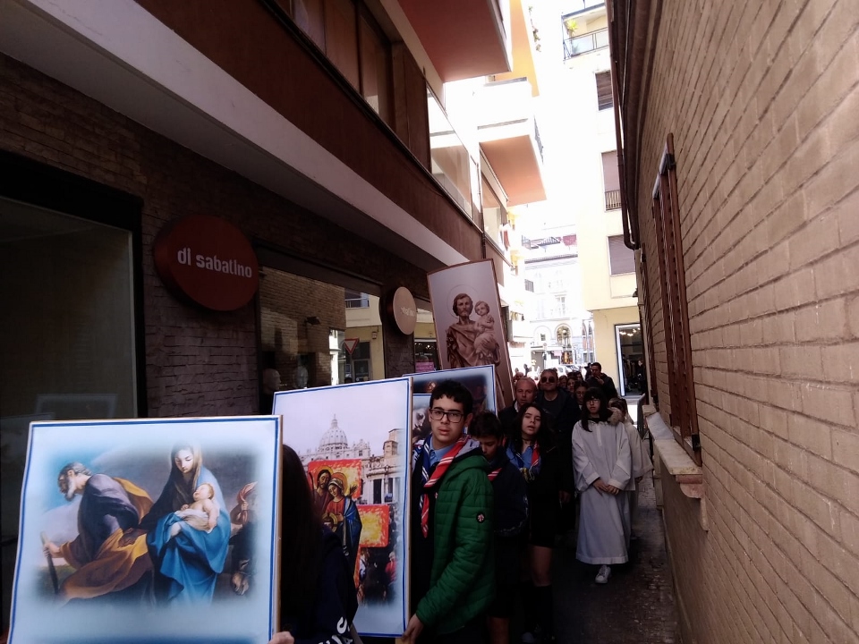 La processione è partita dal Santuario dei Padri Sacramentini: davanti la bella immagine che ritrae la statua del Santo, e poi i chierichetti, i bambini e le loro catechiste, gli scout e i loro capi, infine la folla dei fedeli entusiasti e commossi, soprattutto gli anziani che ricordano le imponenti manifestazioni del tempo in cui la giornata di San Giuseppe era festiva anche civilmente.