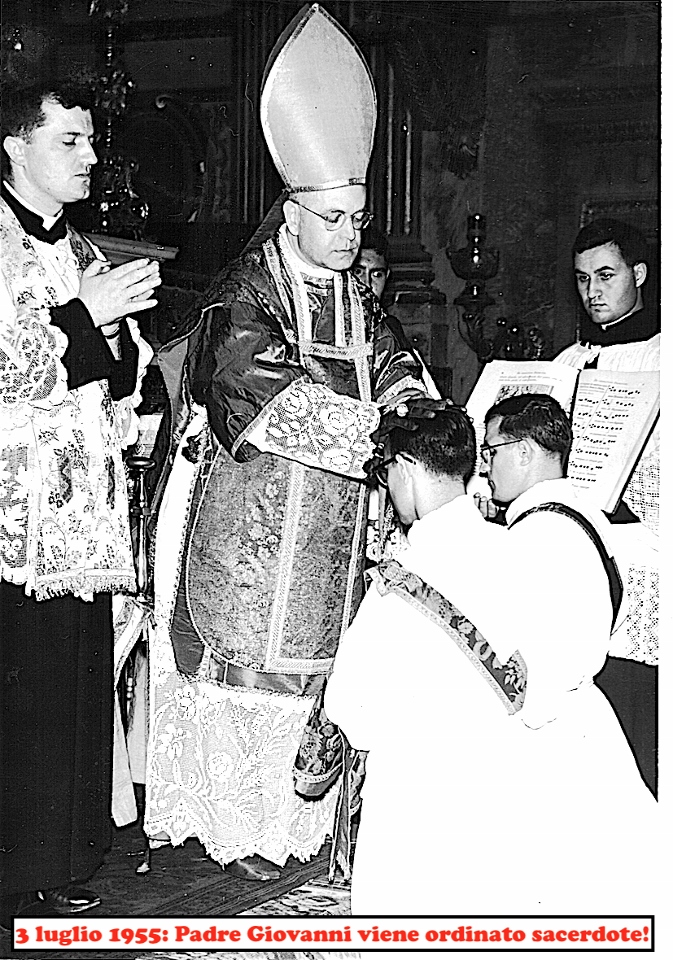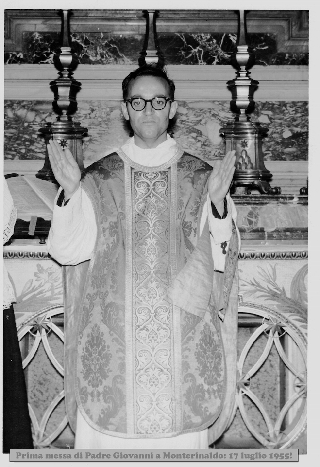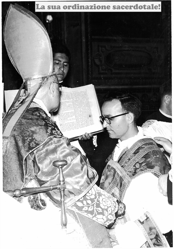 Fu ordinato sacerdote, nell’ordine dei Salvatoriani, il 3 luglio del 1955 nella chiesa di San Marcello al Corso a Roma e celebrò la sua Prima Messa in uno degli altari laterali della Basilica di San Pietro in Roma. A Monte Rinaldo, terra d’origine, la celebrò il 17 luglio 1955.
