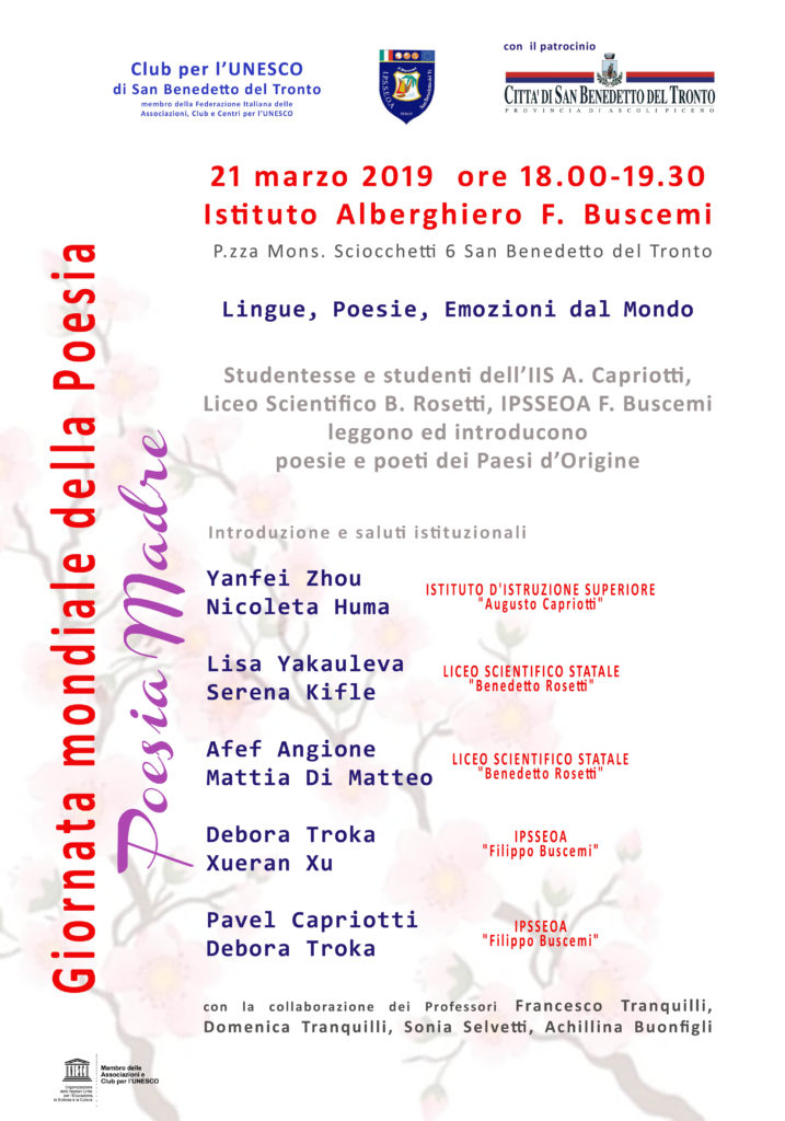 SAN BENEDETTO DEL TRONTO – Per festeggiare la Giornata Mondiale della Poesia, indetta dall’UNESCO, il Club per l’UNESCO di San Benedetto del Tronto ha voluto riunire studentesse e studenti dell’IIS Capriotti, del Liceo Scientifico Rosetti e dell’IPSSEOA Buscemi originari di differenti Nazioni e li ha inviati a scegliere un autore ed una poesia del loro Paese d’Origine da presentare e condividere.