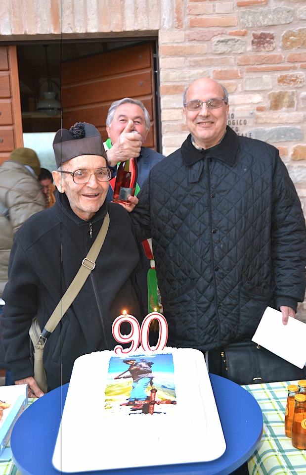 In effetti, Padre Giovanni, i suoi Novant’anni li aveva già raggiunti il 27 Marzo scorso, ma i suoi parrocchiani (in questo sostenuti dall’Amministrazione Comunale, che era presente con il Sindaco Marino Screpanti, dal Comitato di S. Antonio Abate, dall’Associazione Culturale “Il Murello” e dall’Associazione Giovanile “Il Chiostro”), questa sera numerosissimi, gli hanno voluto dimostrare il loro grande affetto, considerazione e stima, con un bellissimo “apericena” svoltosi all’aperto! Si era proprio di fronte alla Chiesa dei Santi Pietro e Silvestro e a fianco della Chiesa di San Gregorio Magno. Qui, infatti, erano stati allestiti tavoli pieni di stuzzichini, aperitivi, pizza, bibite, spumante e, al centro, un’eccezionale torta con le candeline da spegnere: due enormi numeri, 9 e 0! Sulla torta dominava l’immagine che raffigurava Padre Giovanni intento a scalare quella vetta dove volle porre una croce di ferro, da lui stesso forgiata e condotta fin lì, con su scritto: “Gesù Divin Redentore”! E non ci poteva essere torta migliore per lui grande appassionato della montagna e scalatore: ha scalato, finora, 130 vette fino a raggiungere, per ben due volte, anche il Monte Bianco!