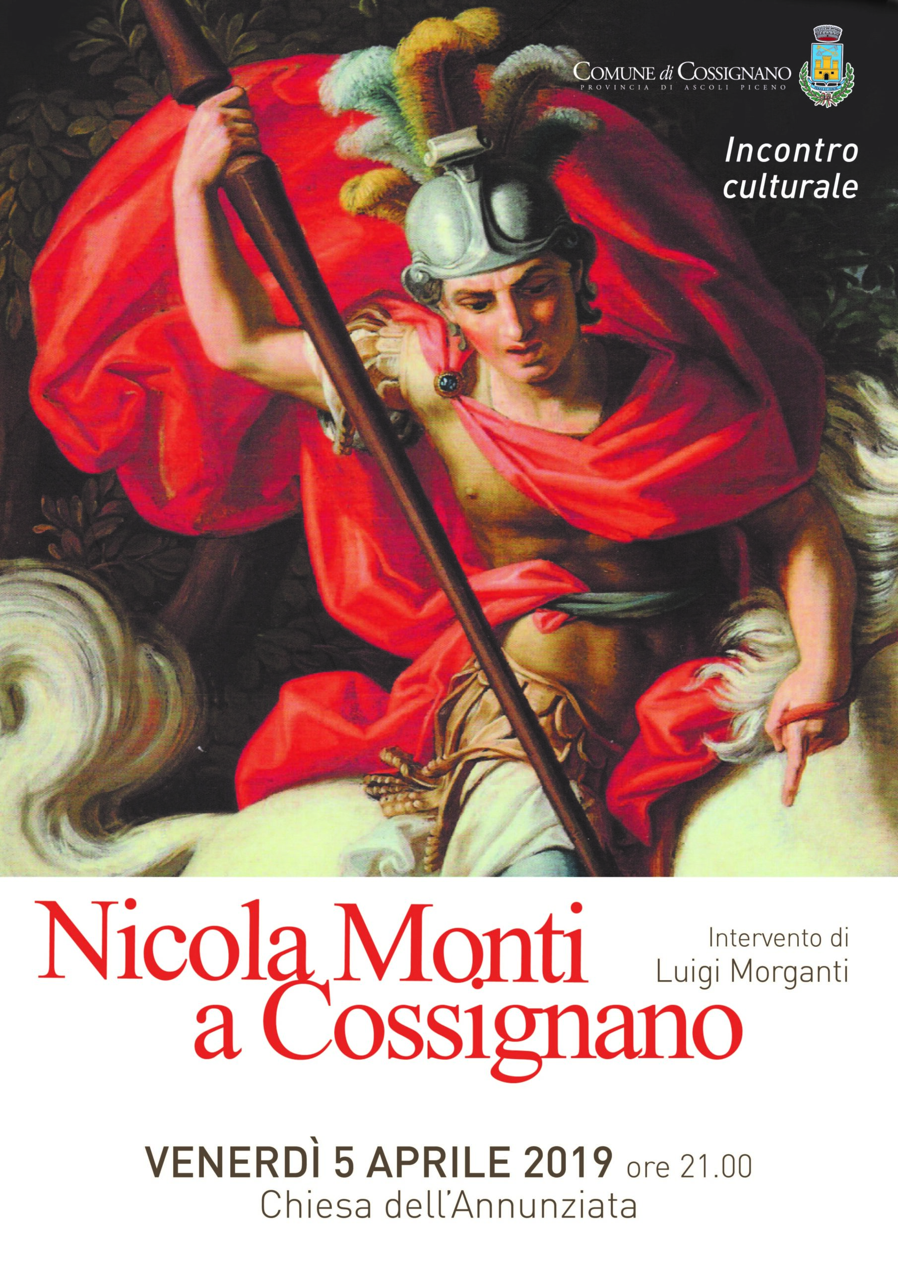 Nicola Antonio Monti (Ascoli Piceno, 1736-1795) è considerato il più importante pittore ascolano del Settecento e uno dei più interessanti del panorama artistico marchigiano. Dopo un primo alunnato presso l’ascolano Biagio Miniera, il giovane Monti si trasferì a Roma dove frequentò la bottega di Pompeo Batoni, che lo indirizzò verso lo studio di Raffaello e della pittura classicista. Qui ottenne importanti riconoscimenti e la vittoria di diversi premi. Nonostante i primi successi, Nicola decise di tornare ad Ascoli, dove si sposò e dedicò il resto della propria vita alla famiglia e alla pittura, dimostrandosi un valente pittore e ritrattista. Numerosissime testimonianze del suo operato sono presenti non solo ad Ascoli e nella sua provincia, ma anche nel resto delle Marche, nel vicino Abruzzo e in Umbria. Tra i dipinti più considerevoli che risalgono negli ultimi suoi anni di vita vengono annoverati, tra gli altri, la tela di San Giorgio (1794) e l’Assunzione della Vergine (1795) conservati nella chiesa di S. Maria Assunta a Cossignano.