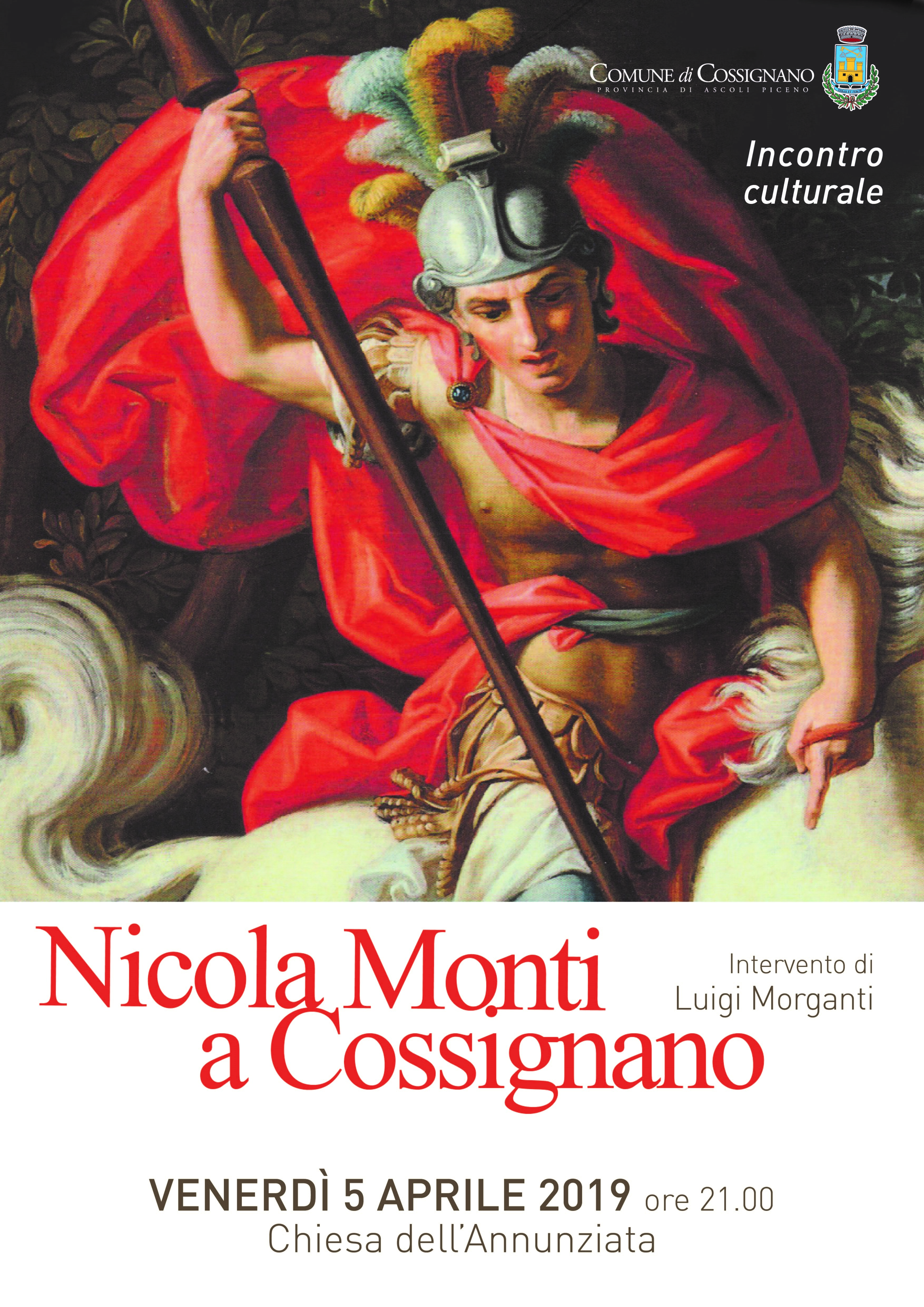 COSSIGNANO – Con il mese di aprile si aprono, come di consueto, gli incontri culturali che si concluderanno con la Festa e Fiera di San Giorgio, patrono della Comunità di Cossignano. Nell’ambito della nuova stagione primaverile quest’anno si propone “I Venerdì della Cultura”. Il programma prenderà il via con il primo appuntamento “Nicola Monti a Cossignano” venerdì 5 aprile 2019, alle ore 21.00, presso la Chiesa dell’Annunziata, Museo civico di Arte Sacra, con la presentazione della biografia e delle opere del pittore a cura del professore Luigi Morganti di Ascoli Piceno.