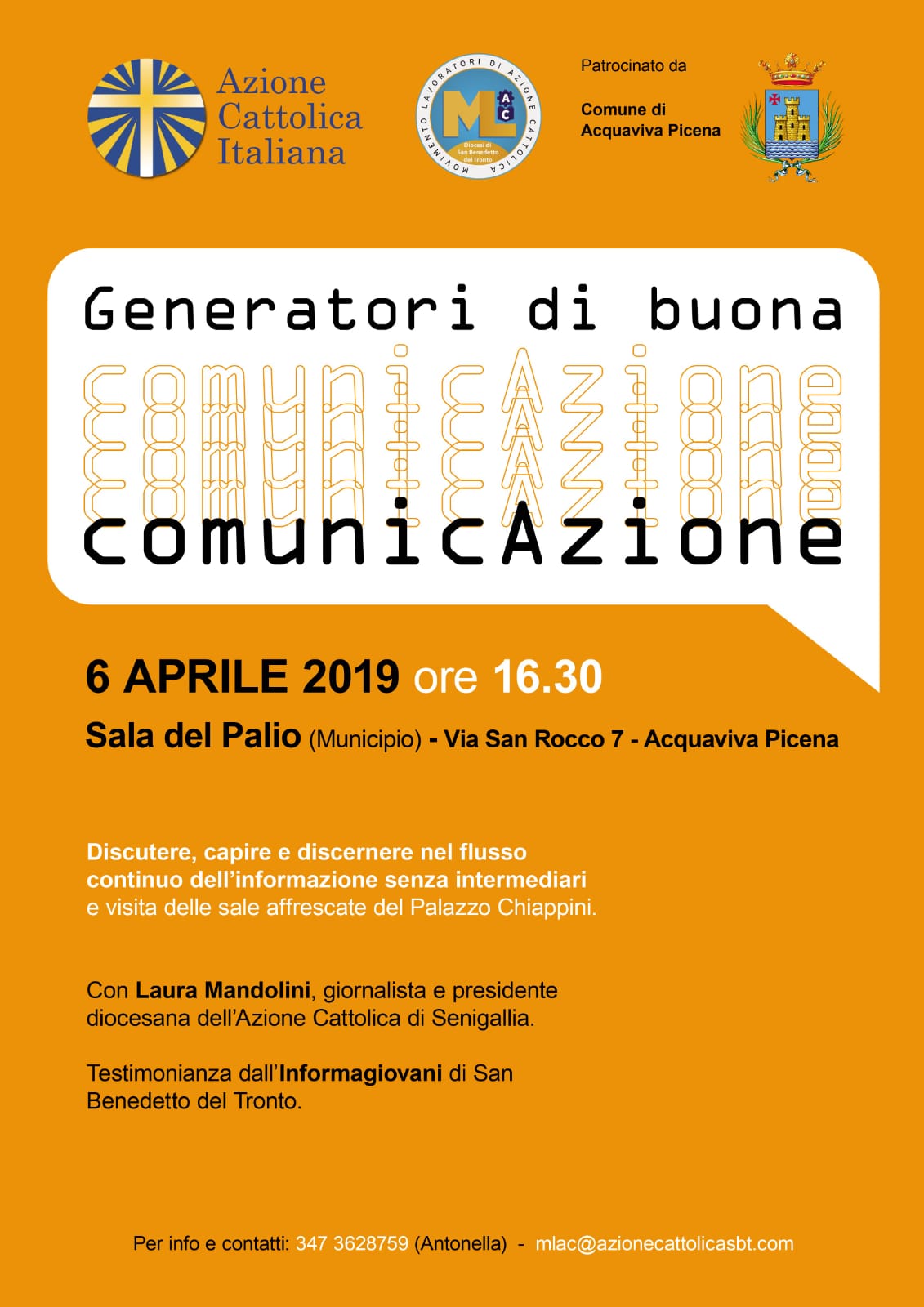 Su queste indicazioni, il Mlac prosegue il proprio percorso di formazione perchè si generi nelle persone consapevolezza e capacità di difendersi di fronte alla disinformazione e all’informazione incompleta per essere promotori di una buona comuncazione. L’incontro “Generatori di buona comunicazione” si svolgerà sabato 6 aprile a Acquaviva, presso la Sala del Palio (sede Municipio) e vede la partecipazione di Laura Mandolini, giornalista professionista e presidente dell’AC di Senigallia.