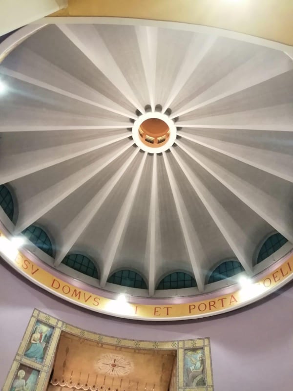La scelta è stata quella del recupero del colore “viola”, a suo tempo garbatamente scelto dall’architetto per dotare lo spazio di quella funzione espressiva e suggestiva che uno “Spazio Sacro” deve saper evocare.