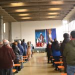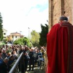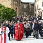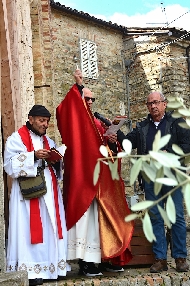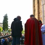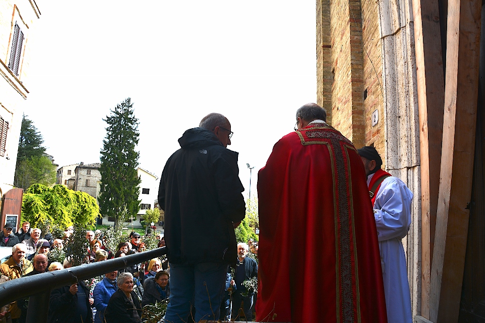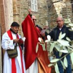 La benedizione dei ramoscelli d’ulivo è stata fatta dal Priore-Parroco Padre Emanuele in collaborazione del suo vice, Padre Giovanni, nel piazzale “Cardinal Petrocchini” proprio sugli scalini che portano nella chiesa di San Gregorio Magno ancora inesorabilmente “incatenata” per i postumi del Sisma del 2016.