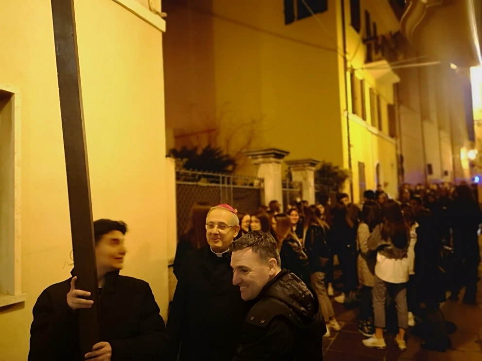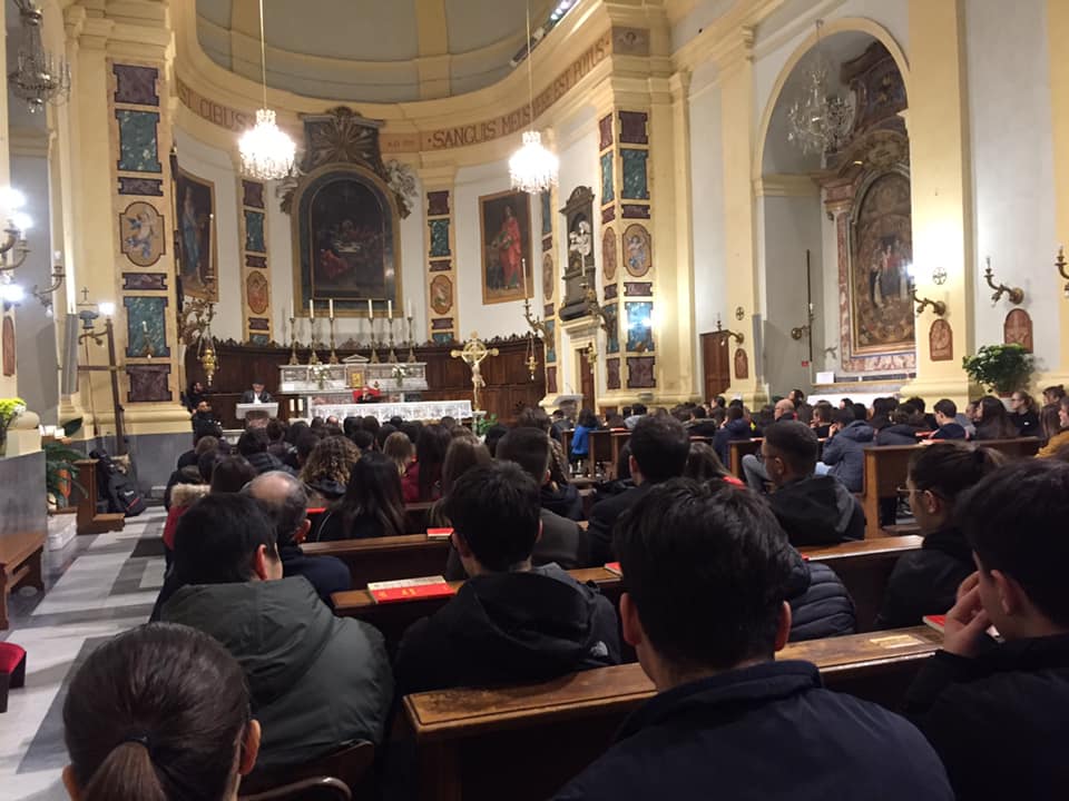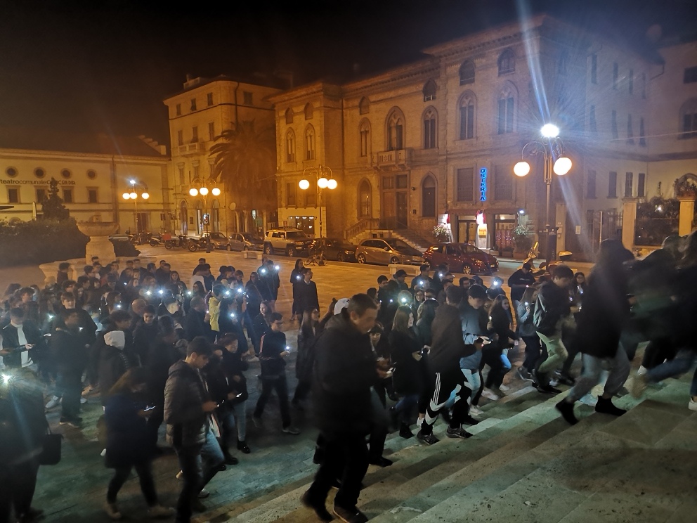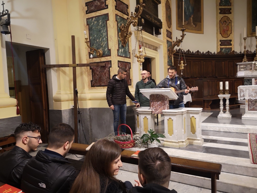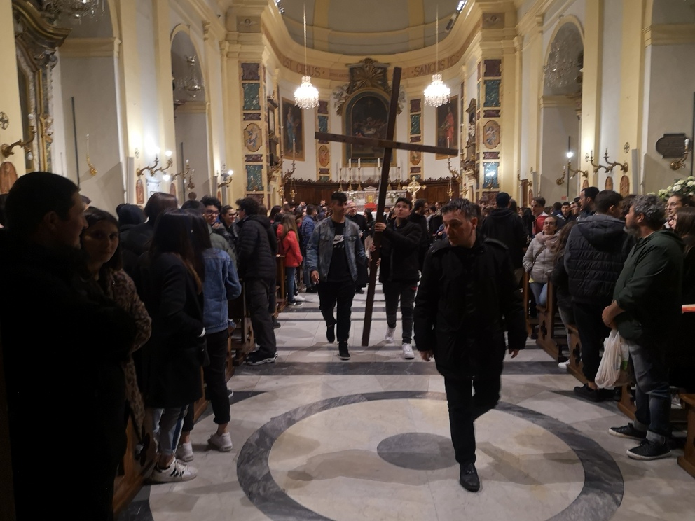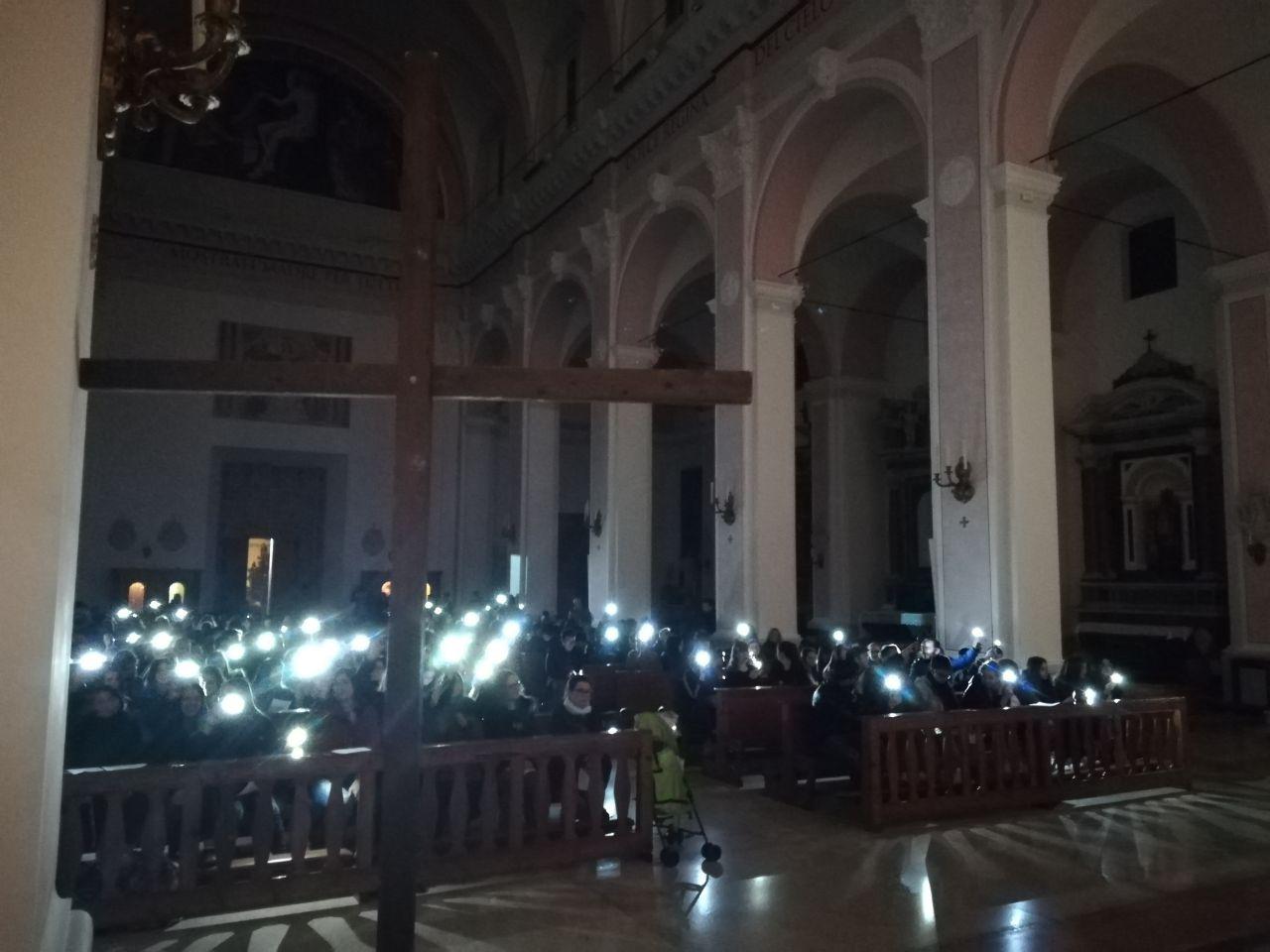 Tra canti, preghiere e anche chiacchierate tra amici, i ragazzi sono scesi dal Paese Alto, in direzione della chiesa di S. Giuseppe, seconda tappa di questa piccola peregrinatio, conclusa presso la basilica Madonna della Marina. Una basilica che ha accolto i giovani al buio ed è stata rischiarata dalle torce degli smartphone. Prima di quelle luci artificiali, ad illuminare la platea ci ha pensato la luce interiore del giovane Lorenzo che, parlando dal pulpito di S. Benedetto Martire, ha raccontato il suo cammino di Fede, iniziato intorno ai 16 anni. Un’età vissuta come tanti altri adolescenti: serate a ballare con gli amici e la compagnia di qualche ragazza. Ma la musica, prima o poi, finisce e le ragazze se ne vanno. «Sono arrivato a chiedermi: è tutto qui? A 16 anni ero insoddisfatto», ha detto il ragazzo. Un sentimento negativo che poi è radicalmente cambiato, in meglio, grazie a Lui.