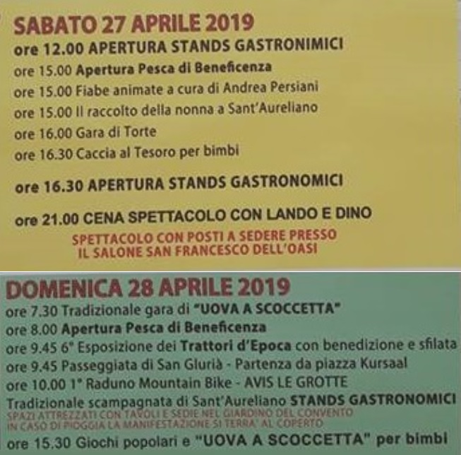 Padre Michele Masaccio: “Come tradizione Sant’Aureliano è un giusto mix di appuntamenti religiosi e laici; apriamo le porte dell’Oasi Santa Maria ai Monti per un weekend all’insegna del divertimento e della riflessione. Ringrazio sin da ora tutto lo staff organizzatore ed i molteplici sostenitori privati all’edizione 2019”.