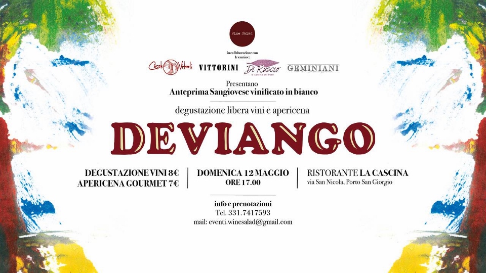 La presentazione, in anteprima, della nuova etichetta “DEVIANGO” delle Cantine Casale Vitali, Vittorini, Di Ruscio, Geminiani, avverrà Domenica 12 maggio presso il “Ristorante La Cascina” di Porto San Giorgio con un “Convegno di Presentazione + Degustazione Vini + Apericena con la seguente programmazione: