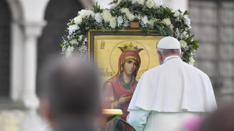 Perchè questo sia sempre il destino della Bulgaria, Papa Francesco si rivolge alla Beata Vergine Maria, Regina del cielo e della terra, con gli occhi rivolti all’incona della Madonna di Nesebar, che già San Giovanni XXIII ha amato e venerato tanto da portarne una copia con sè in Vaticano: