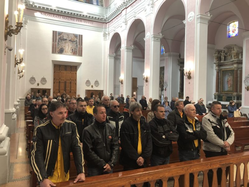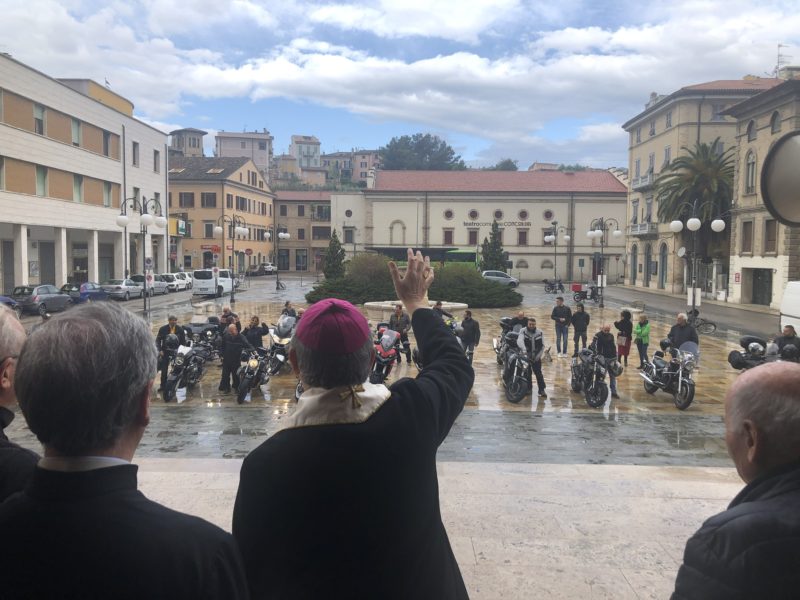 SAN BENEDETTO DEL TRONTO – Domenica 5 maggio, alle 9.15, il Vescovo Carlo ha benedetto le moto dei soci del Motoclub RDV di San Benedetto del Tronto, convenuti in Piazza Nardone. La “motobenedizione”, che avviene sempre a ridosso della Pasqua, è giunta alla sua XIII edizione. Suggestive le parole del rito con le quali vengono benedetti i centauri e le loro moto: “Dio onnipotente, Creatore del cielo e della terra,  che nella tua multiforme sapienza hai dato all’uomo ingegno e immaginazione per fabbricare nuovi mezzi di trasporto, fa’ che i conducenti di queste moto, nei vari percorsi di lavoro o di svago, operino sempre con perizia e prudenza per la sicurezza e l’incolumità di tutti e avvertano accanto a sé la tua continua presenza”.