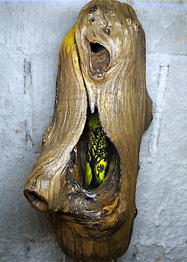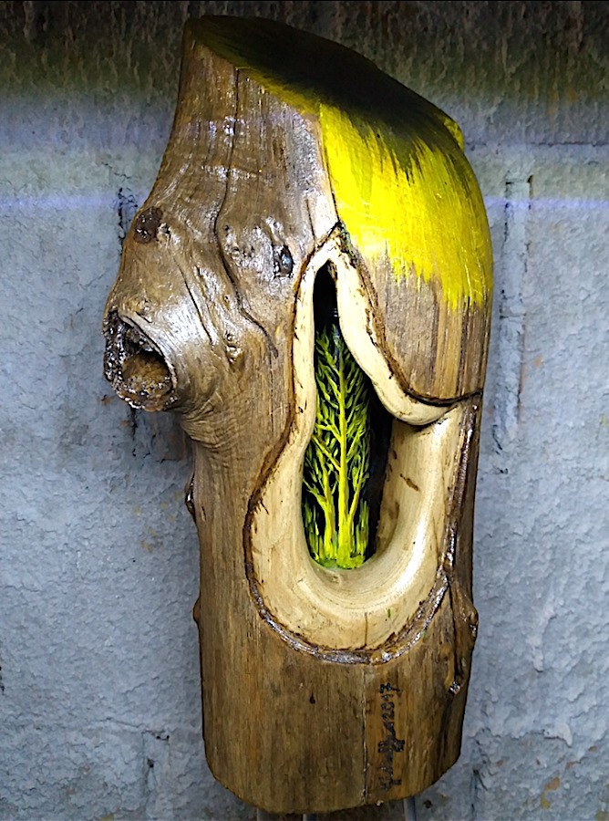 Egli è quell’artista che crea le sue opere grazie ad incontri fortuiti con quei pezzi di legno che, trovati durante le sue passeggiate nei boschi, in montagna e ovunque, suscitano la sua curiosità e lo ispirano nella creazione, assecondandone i tratti di meravigliosi prodotti artistici.