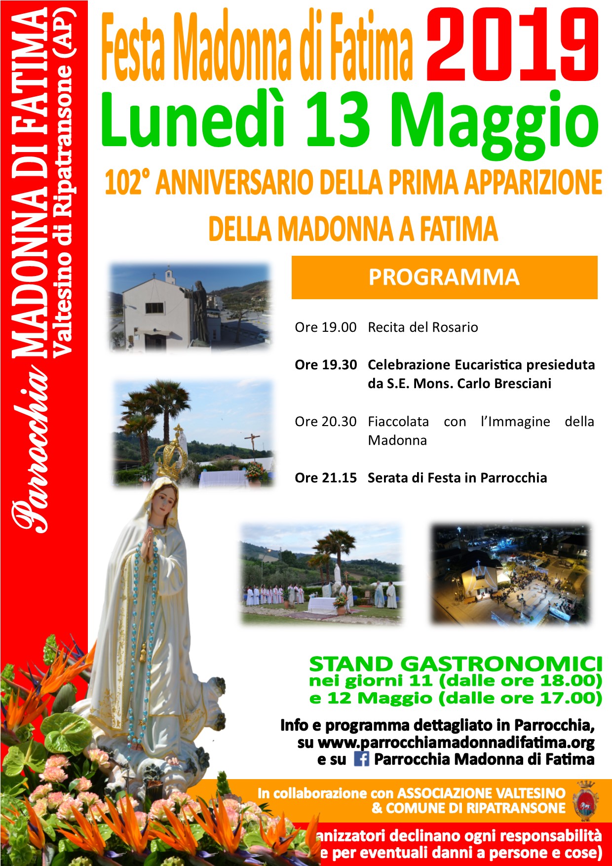 Informazioni dettagliate sul programma della nostra Festa sono presenti nelle foto che accompagnano questo articolo e sono disponibili in Parrocchia, sul nostro Sito Internet www.parrocchiamadonnadifatima.org e sulla nostra Pagina Facebook Ufficiale Parrocchia Madonna di Fatima (https://www.facebook.com/ParrocchiaMadonnaDiFatimaValtesinoRipatransoneAp/?ref=page_internal )