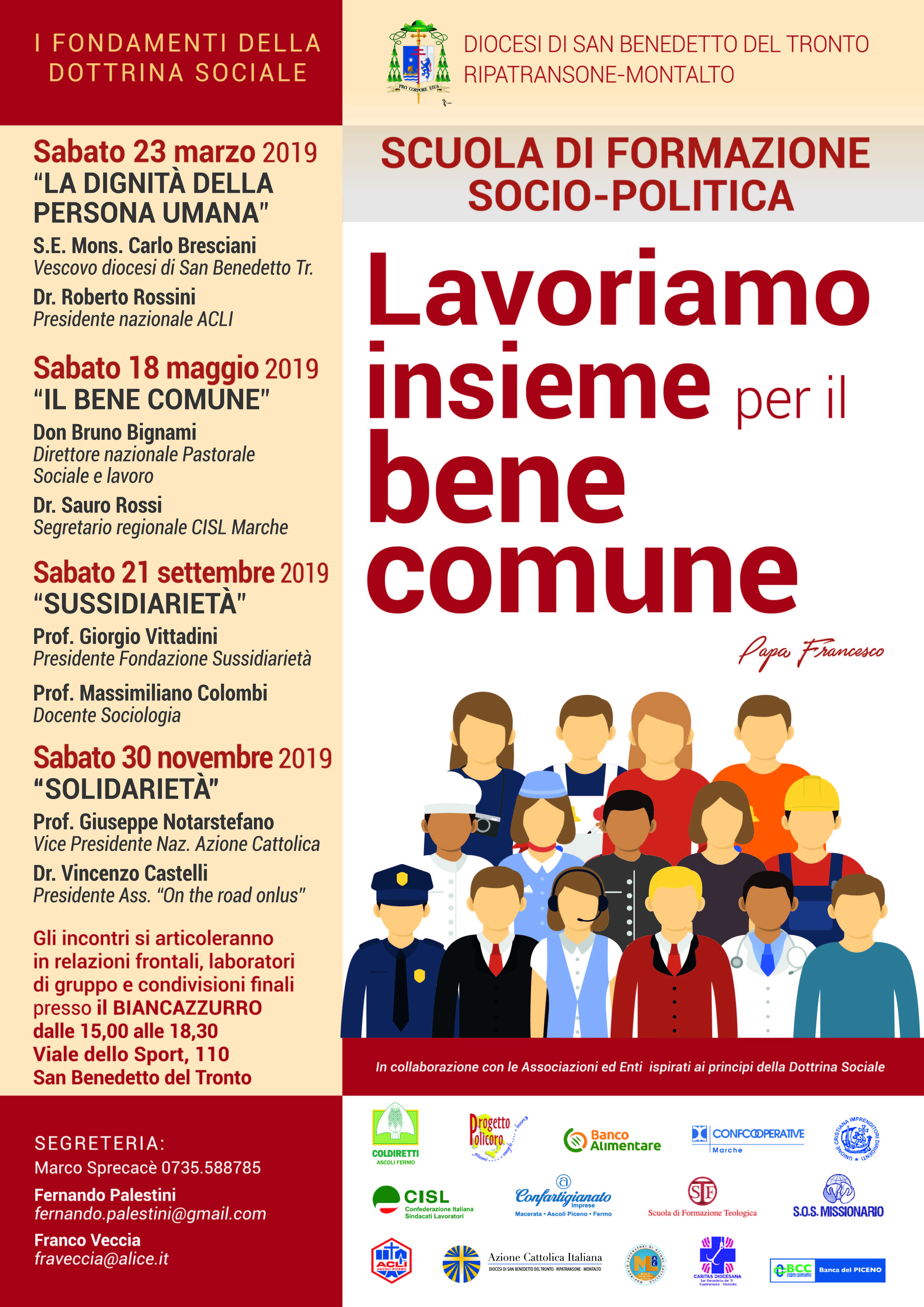 DIOCESI – Il “bene comune” è uno dei principi fondamentali della Dottrina Sociale della Chiesa ed è il titolo del secondo incontro della scuola di formazione socio-politica organizzata dalla Diocesi di San Benedetto del Tronto-Ripatransone-Montalto dal titolo “Lavoriamo insieme per il bene comune”.