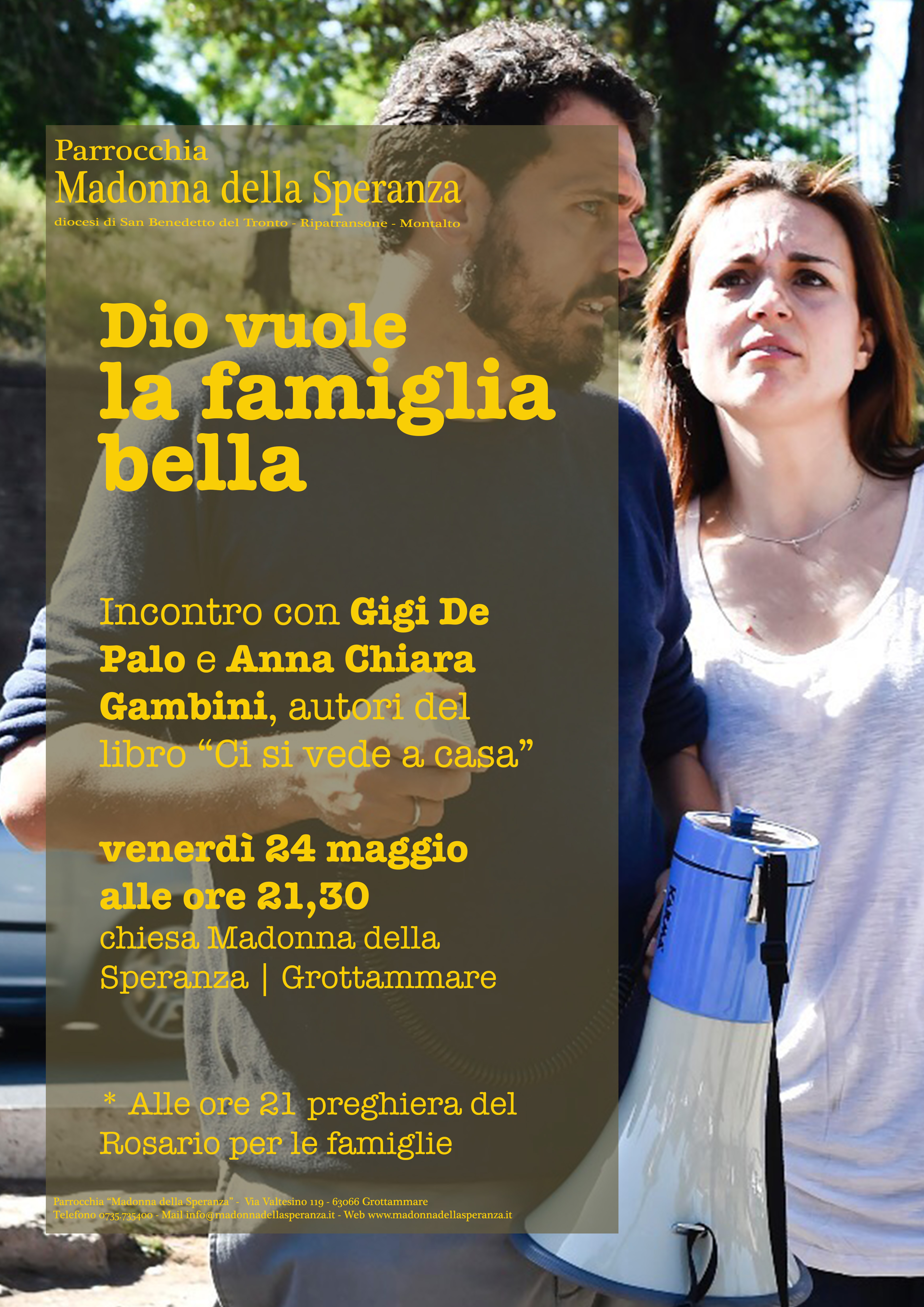 GROTTAMMARE – Venerdì 24 maggio, presso la chiesa Madonna della Speranza a Grottammare, si parlerà di famiglia con Gigi De Palo, presidente nazionale del “Forum delle Associazioni Familiari” e con sua moglie Anna Chiara Gambini, autori del libro “Ci vediamo a casa. La famiglia e altri meravigliosi disastri“.