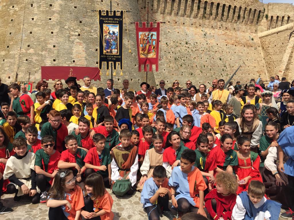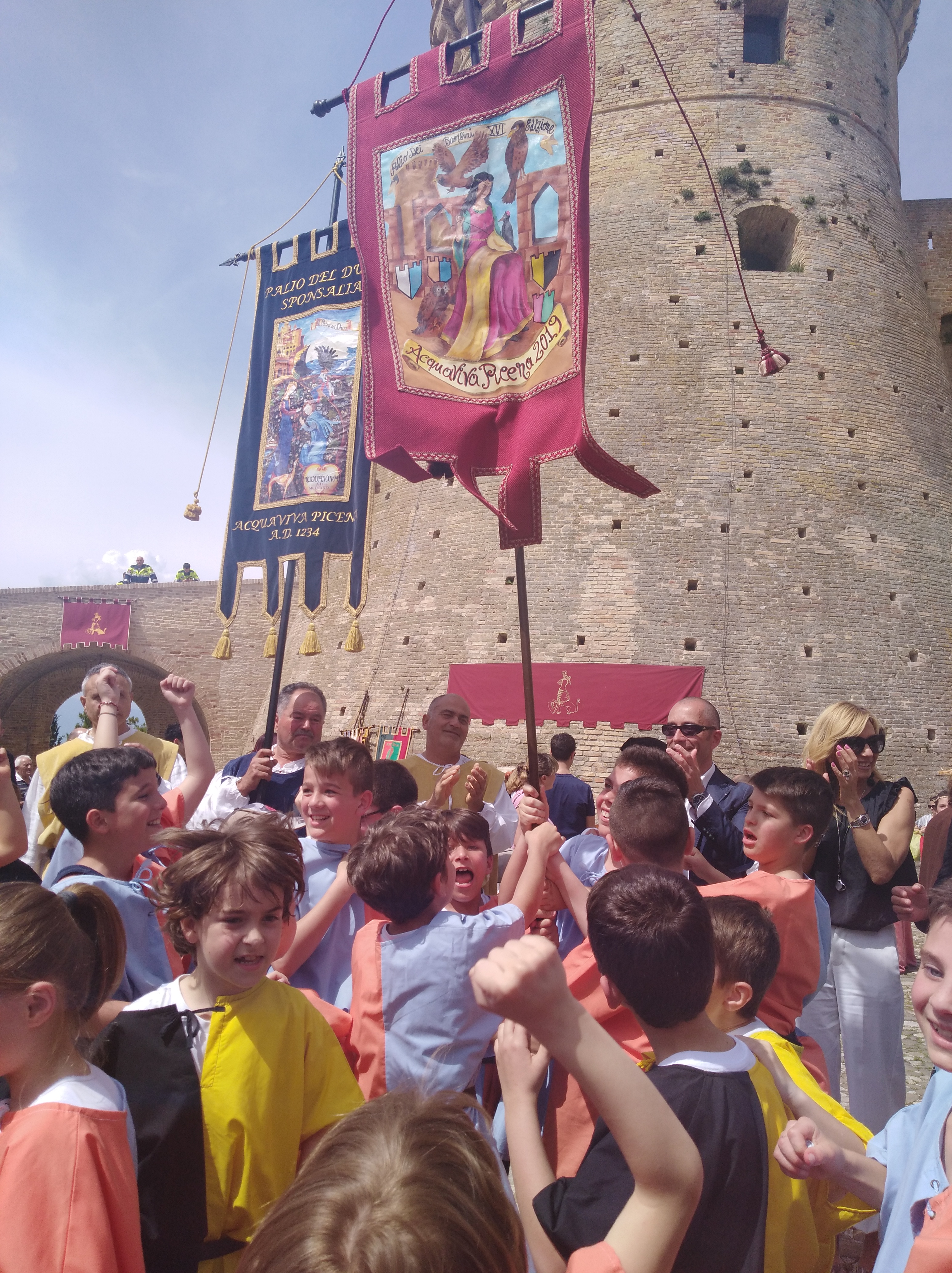 La manifestazione è stata organizzata dall’associazione Palio del Duca ed è inserita nel programma scolastico P.O.F. che ha come finalità la conoscenza del proprio territorio e l’avvicinarsi alla sua storia e alle sue tradizioni. Il Palio dei Bambini è la rievocazione storica del matrimonio di Forasteria Degli Acquaviva con Rinaldo Dei Brunforte celebrato nel 1234, più conosciuta come Sponsalia. Hanno partecipato al Palio quaranta bambini di Monteprandone , sessantaquattro bambini di Monsampolo del Tronto centotrentanove bambini di Acquaviva. Tutti i bambini sono stati suddivisi in quattro rioni: Falco con i colori verde e rosso i bambini di Monteprandone, Picchio con i colori bianco e celeste i bambini di Monsampolo, Aquila con i colori azzurro e arancione e Civetta con i colori gialli e nero i bambini di Acquaviva. Dopo il corteggio storico, in piazza del Forte è stata impartita la benedizione al Drappo da parte del parroco don Alfredo; il Drappo del Palio è stato disegnato da Sofia dell’istituto Scolastico di Acquaviva. Tutti i bambini si sono sfidati in vari giochi: la corsa con i sacchi, tiro delle palle nei cesti, corsa con le pajarole, lancio dei cerchi e tiro alla fune. Il Rione vincitore è stato quello dell’Aquila. Il presidente dell’associazione Palio del Duca cav. Nello Gaetani ha detto: “Una bella manifestazione che ci riempie il cuore e ci gratifica del grosso impegno profuso in sei mesi di preparazione, è stato molto bello vedere la piazza gremita di tanti genitori nonni e amici che facevano il tifo per i loro ragazzi”. I giochi sono stati intervallati dalle esibizioni delle danzatrici dell’associazione La Koreutica della dott.ssa Maria Luigia Neroni; novità di quest’anno un drago fumante che viene abbattuto dalle danzatrice amazzoni a dimostrazione che il bene vince sempre sul male, l’idea è tratta da uno spettacolo teatrale per bambini della Compagnia Teatro del Giardino di Guardia Grele dell’attore e regista Fabio Di Cocco. Presenti alla manifestazione il sindaco di Acquaviva Rosetti e la dirigente scolastica dell’istituto scolastico di Acquaviva Valentina Bellini. Si ringrazia la Provincia di Ascoli Piceno per il patrocinio, i Comuni di Acquaviva, Monteprandone e Monsampolo, le dirigenti scolastiche e le insegnanti, la prof.ssa Agresti, la Stazione dei Carabinieri di Acquaviva, la Croce Rossa di San Benedetto del Tronto, la Banca del Piceno, i mecenati, i forni Acquaviva e Vulpiani Massicci, Protezione Civile Gran Sasso sezione di Mosciano Sant’Angelo e quanti hanno collaborato alla riuscita della manifestazione.