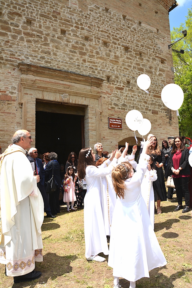 Guidati quindi dal Priore, tutti all’esterno della Chiesa dove, i bambini appena comunicati, hanno lanciato in aria dei bianchi palloncini che recavano la scritta del loro nome!