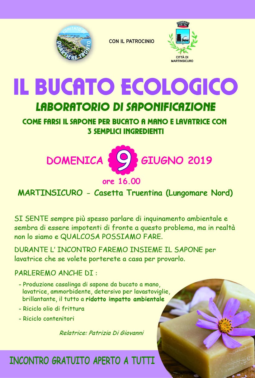 MARTINSICURO – Il Comitato di Quartiere Tronto, con il patrocinio del Comune di Martinsicuro, organizza un evento dal titolo “Il bucato ecologico” che si terrà domenica 9 giugno, alle ore 16:00, presso la Casetta Truentina sul Lungomare Nord. Nel corso del pomeriggio si svolgerà un laboratorio di saponificazione e si spiegherà come farsi, in casa, il sapone con tre semplici ingredienti.