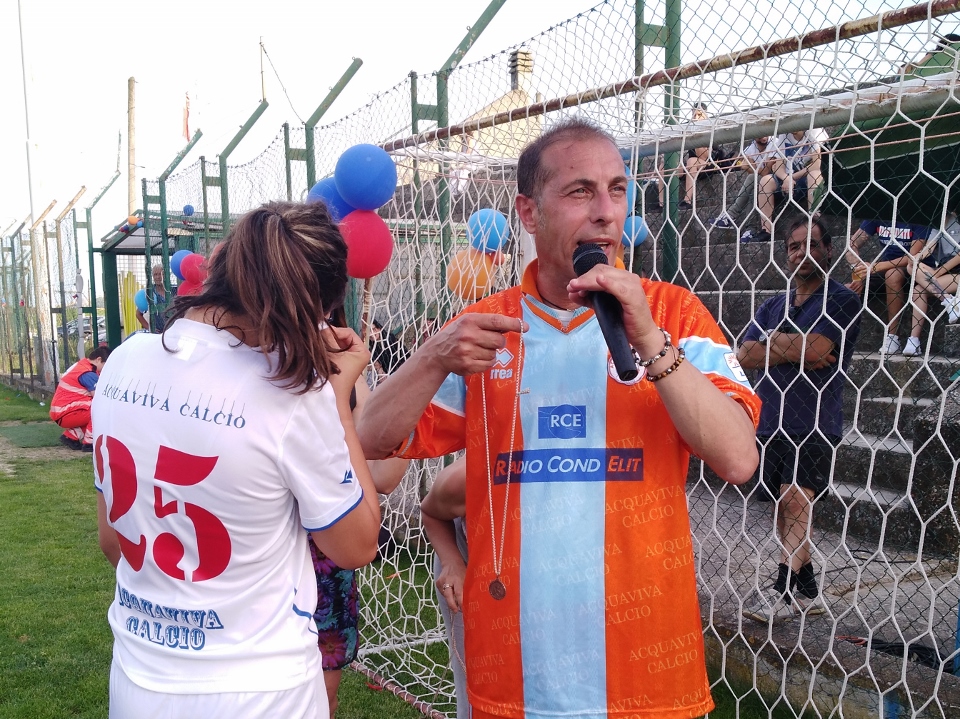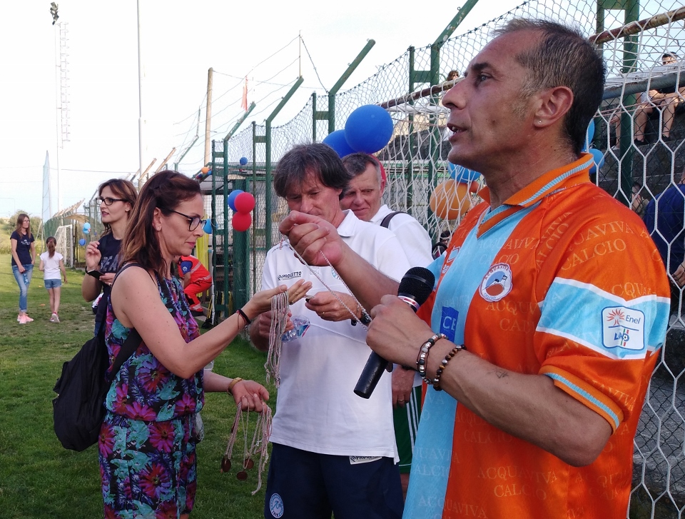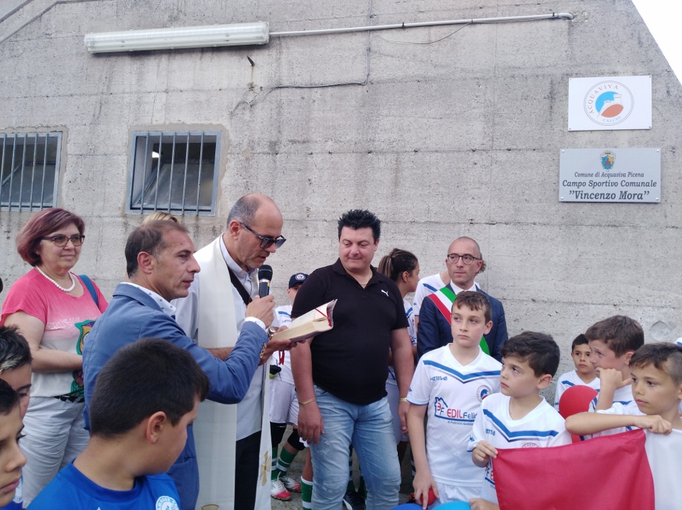 Io ho conosciuto personalmente Vincenzo Mora e lo ricordo un uomo disposto a dare anima e corpo per questa squadra, per questo paese, per questi ragazzi. Era una persona leale e seria, se capitavano dei confronti io ricordo che non se ne andava mai senza dare la mano e salutare. Io direi un uomo come pochi di questi tempi, un vero uomo. L’Amministrazione Comunale di Acquaviva si impegnerà a sistemare tutti gli impianti sportivi, ci sono a disposizione duecentomila euro. Massimiliano Mora, figlio di Vincenzo, ha detto: “Ringrazio tutti, dagli organizzatori all’amministrazione comunale, questa festa è un cosa eccezionale, mio padre ha dato tanto alla squadra e al paese e adesso questo paese lo ricompensa. Grazie a tutti”. Il vice sindaco Balletta ha detto: “Ringrazio tutti, è bello vedere tanta gente riunita per festeggiare la squadra del paese, vedere le vecchie glorie dell’Acquaviva Calcio e della Sambenedettese, squadra da sempre legata al nostro paese. Oggi abbiamo invitato ad essere qui con noi anche i ragazzi della Curva Nord Massimo Cioffi che raccoglieranno i fondi da destinare al progetto Ballarin. Ringrazio Radio Club Piceno, l’Ass.ne Palio del Duca, il Comandante Maresciallo della Stazione dei Carabinieri di Acquaviva e i suoi uomini per la presenza, ringrazio la Croce Azzurra, gli street food, ringrazio Massimiliano e tutta la famiglia Mora per quello che ha fatto e continua a fare per l’Acquaviva Calcio, ringrazio le squadre che hanno preso parte al torneo, Vit Samb, Grottammare e Ripatransone, Ringrazio il presidente Luigi Capretti, Luigi Neroni, tutti i dirigenti, gli allenatori dell’Acquaviva Gianluigi Marinangeli, Federico Prosperi, Giuseppe Falà, ringrazio la Edil Felicioni e la Movinox. Ringrazio Sandro Benigni per la telecronaca della giornata. Ringrazio della presenza e dell’appoggio dimostrato l’assessore alla cultura e turismo Riga, l’assessore ai lavori pubblici Ionni, l’assessore alle politiche sociali Massicci e i consiglieri Vertemati e Palmioli, ringrazio il parroco don Alfredo, ringrazio tutti quelli che in qualche modo hanno fatto qualcosa per la squadra e per realizzare questa festa. Vi auguro un buon proseguimento, dopo la partita delle vecchie glorie dell’Acquaviva e della Samb, dove giocherò anche io rimettendo la mia maglia dai colori azzurro arancio, rimanete ancora con noi perché verrà proiettato un video con filmati e foto storici delle due squadre”.