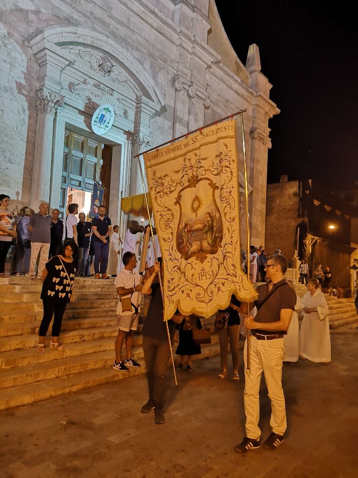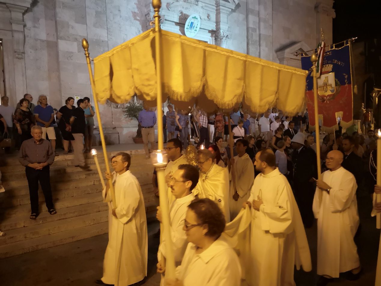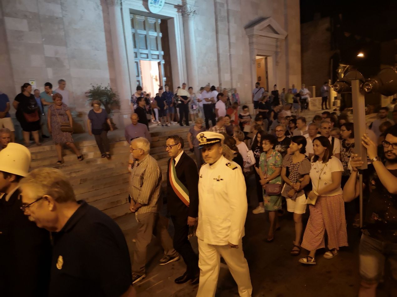 Terminata la funzione, l’Ostensorio con l’ostia consacrata è stato portato in processione alla presenza, tra gli altri, del sindaco Pasqualino Piunti e del comandante della Capitaneria di porto, Mauro Colarossi. Con la polizia municipale impegnata a gestire la viabilità e la presenza discreta di carabinieri e agenti della polizia di Stato, il corteo è partito da piazza Nardone, per attraversare alcune delle principali arterie cittadine, come le vie pizzi, Gramsci e Crispi.