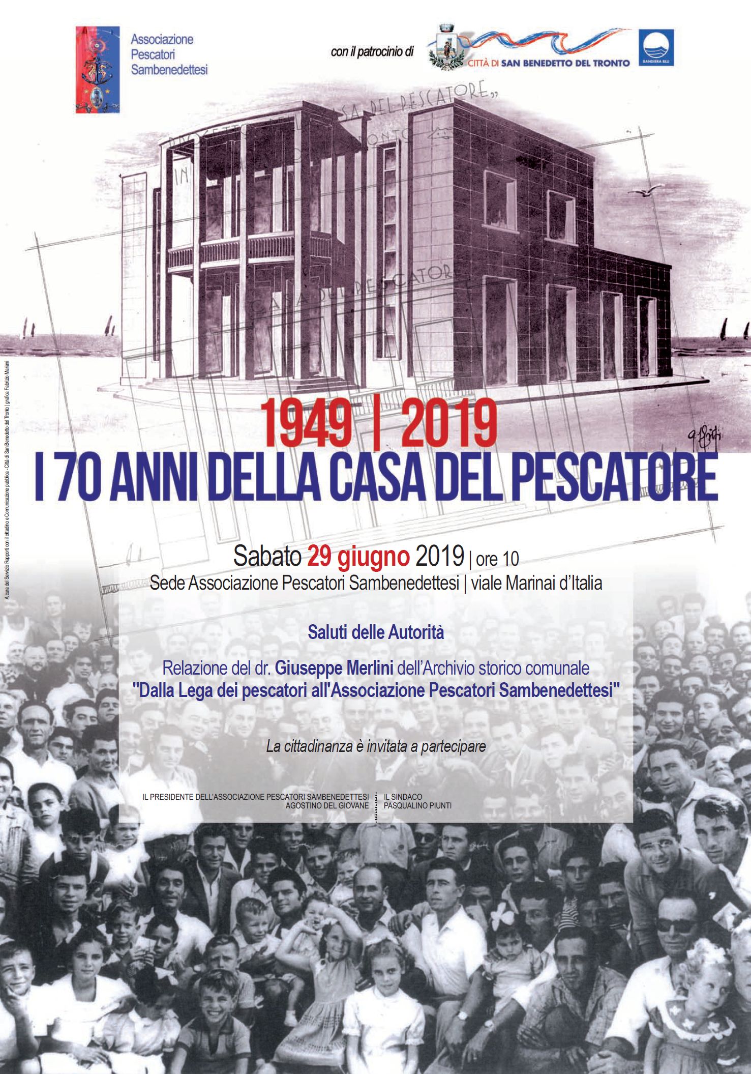 SAN BENEDETTO DEL TRONTO – Sabato 29 giugno, alle 10, nella sede di viale Marinai d’Italia, si svolgerà una cerimonia commemorativa in occasione dei 70 anni dall’inaugurazione della Casa del Pescatore. L’iniziativa, curata dall’Associazione Pescatori Sambenedettesi con il patrocinio del Comune, vedrà, dopo i saluti delle autorità, l’intervento di Giuseppe Merlini, archivista storico del Comune che traccerà un percorso storico della vita dell’edificio, dalla Lega dei Pescatori fino a giorni nostri.