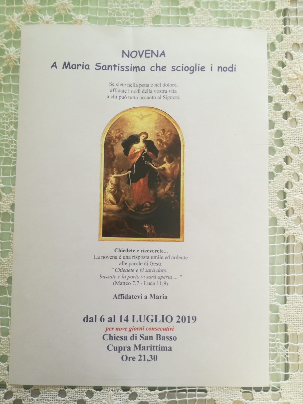 Da sabato 6 luglio alle ore 21.30, per nove giorni, fino a domenica 14 luglio, si pregherà la Novena a Maria che scioglie i nodi, nella Chiesa di San Basso a Cupra Marittima. Tutti sono invitati a questo percorso di fede di speranza di carità fraterna, un momento che non è solo intimo ma è finalizzato a presentare a Maria, coralmente, i nodi della nostra comunità, dell’Italia del mondo intero.