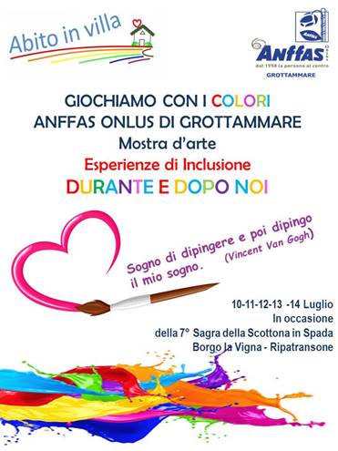 RIPATRANSONE – In occasione della 7° “Sagra della Scottona in Spada”, che si terrà da 10 al 14 Luglio a Ripatransone, presso la Località la Vigna, l’Anffas Onlus di Grottammare proporrà al pubblico la mostra dei quadri degli artisti disabili realizzati grazie all’artista Patrizio Moscardelli.