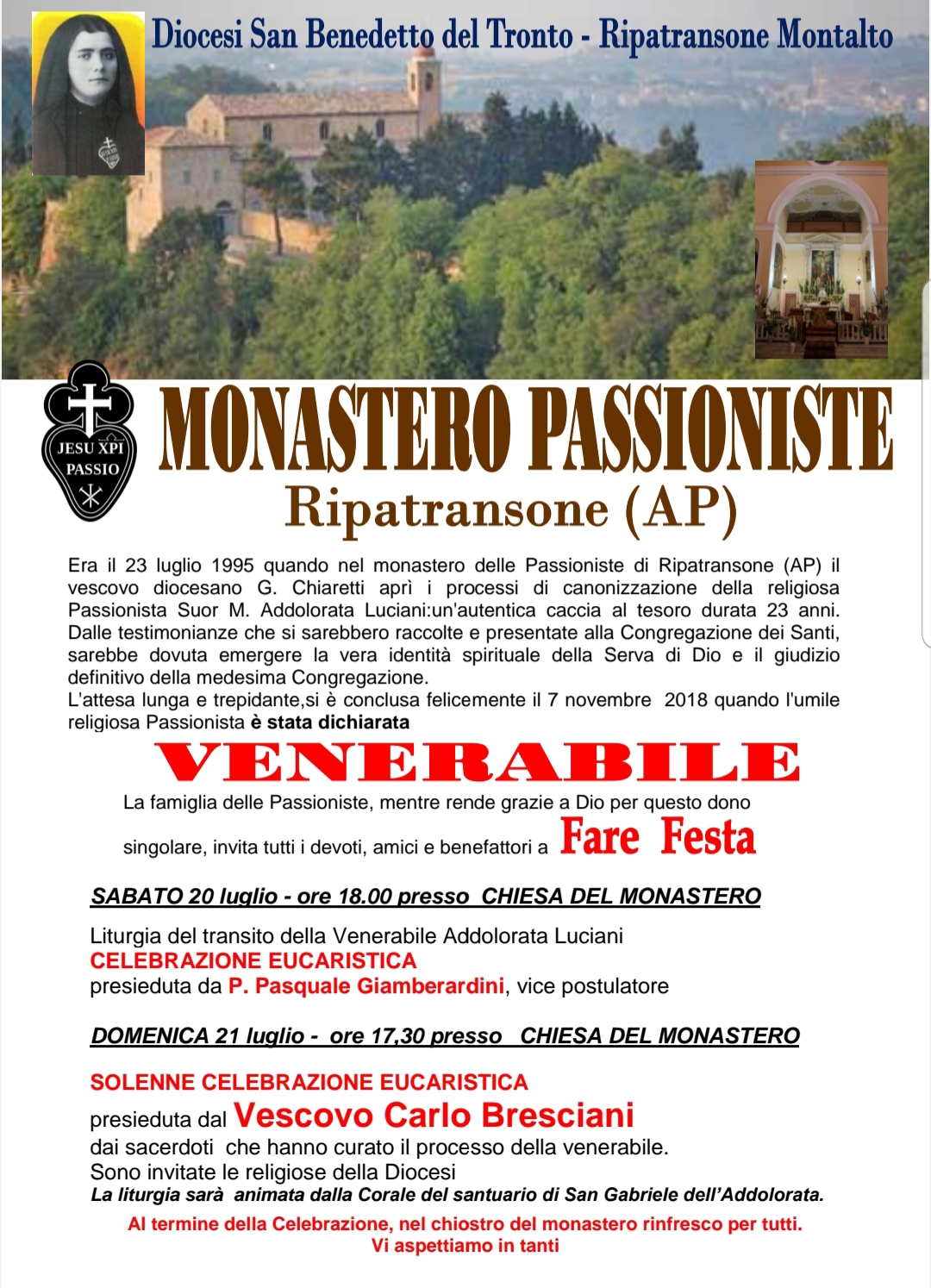 Per questo motivo, la famiglia delle passioniste invita i fedeli ad unirsi alla propria gioia attraverso due celebrazioni eucaristiche. La prima avrà luogo sabato 20 luglio alle 18.00 presso la chiesa del monastero, dove verrà celebrata la liturgia del transito della Venerabile Maria Addolorata Luciani con la Santa Messa presieduta da padre Pasquale Giamberardini, vice postulatore della causa.