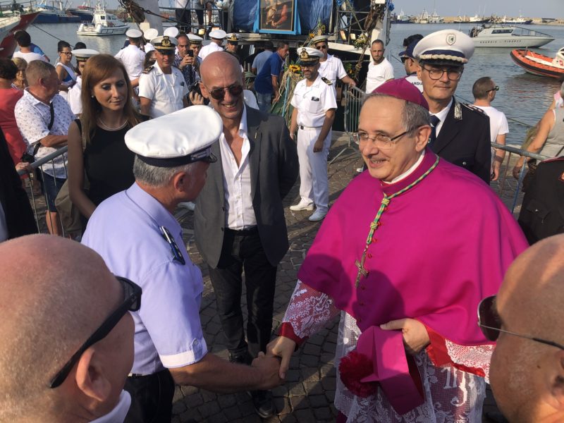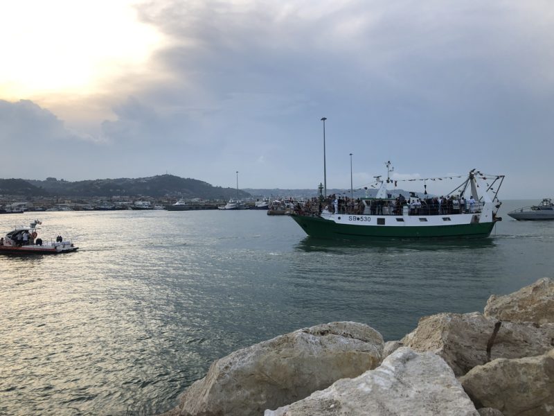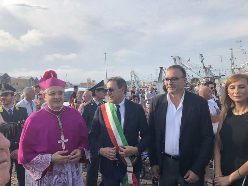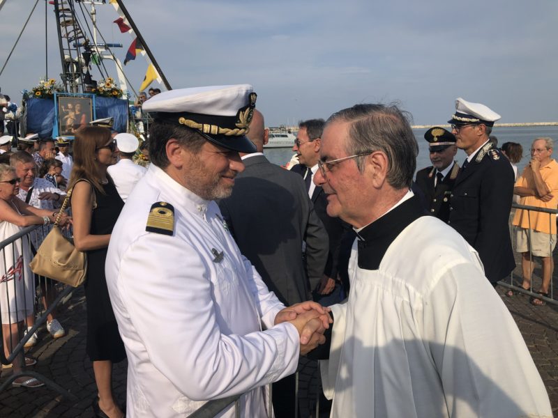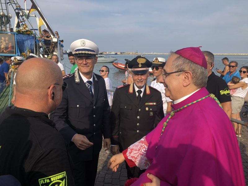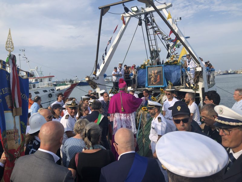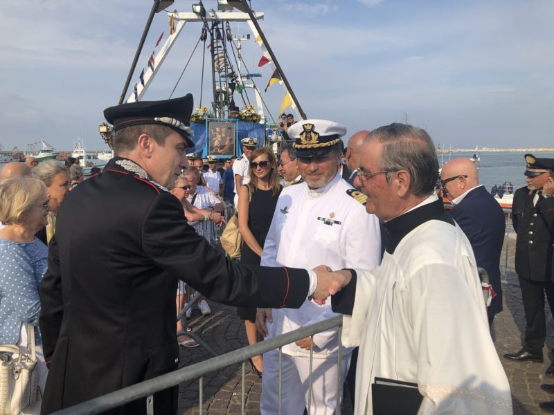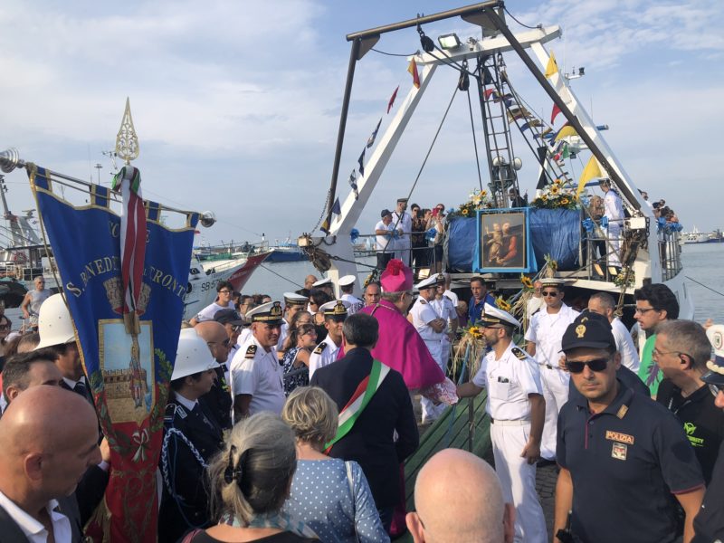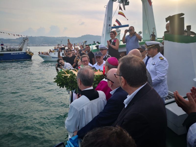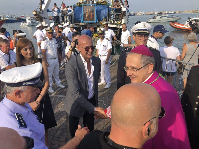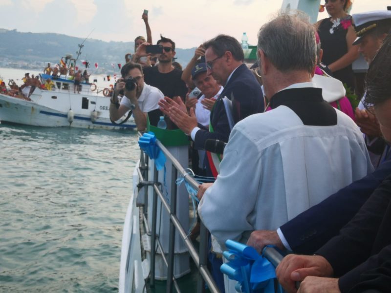 SAN BENEDETTO DEL TRONTO – La festa della Madonna della Marina è giunta a uno dei suoi momenti più suggestivi e significativi: la tradizionale processione in mare con la venerata immagine della Vergine, quest’anno ospitata sull’imbarcazione “Marcantonio II”. Presenti a bordo le autorità religiose, civili e militari della città. Dopo la preghiera recitata dal vescovo Carlo, il “Marcantonio II” è salpato, lasciando il porto accompagnata dallo sguardo dei fedeli e dei turisti assiepati numerosi sulle estremità dei moli e dal fragoroso scoppio dei fuochi d’artificio.