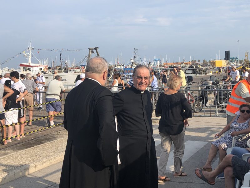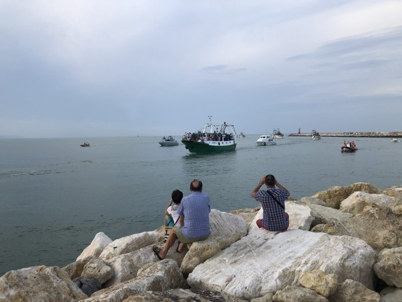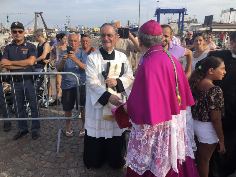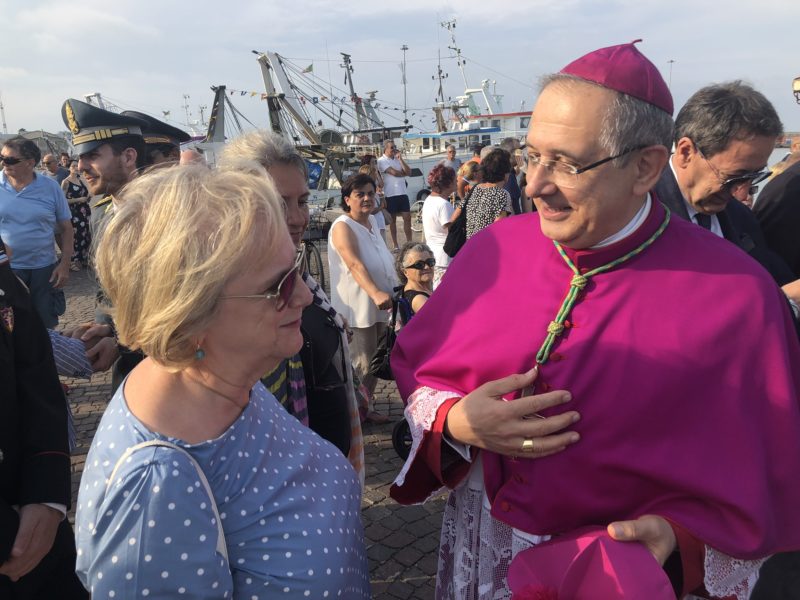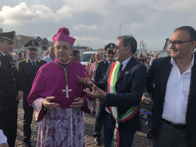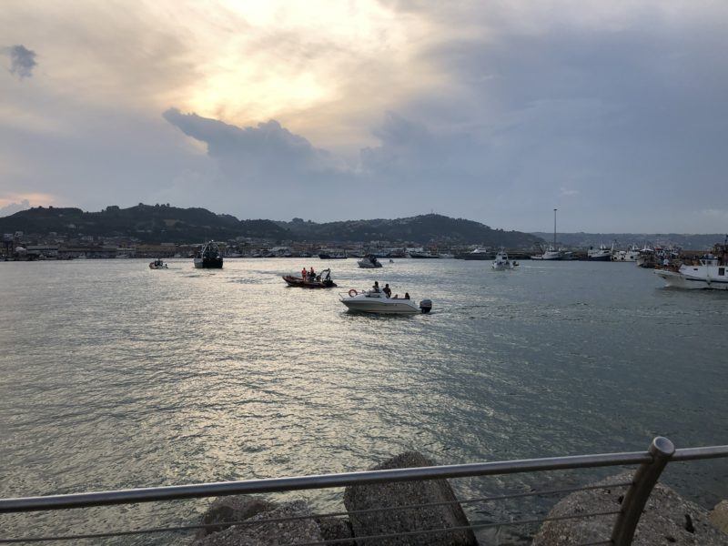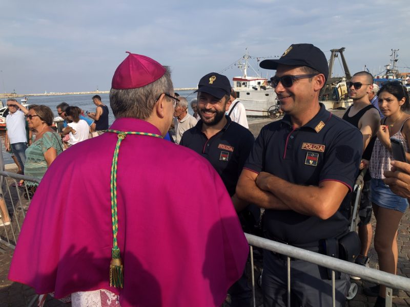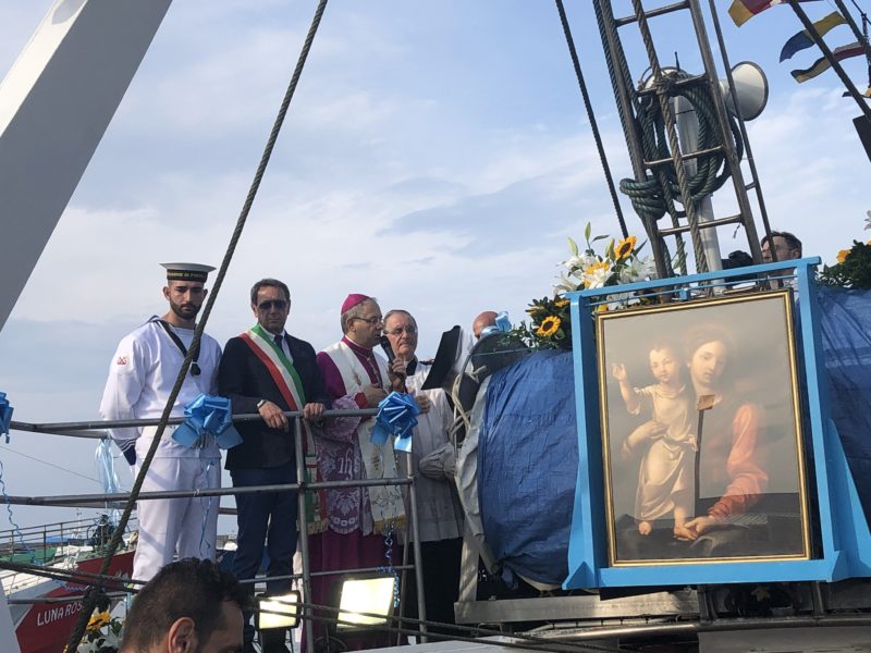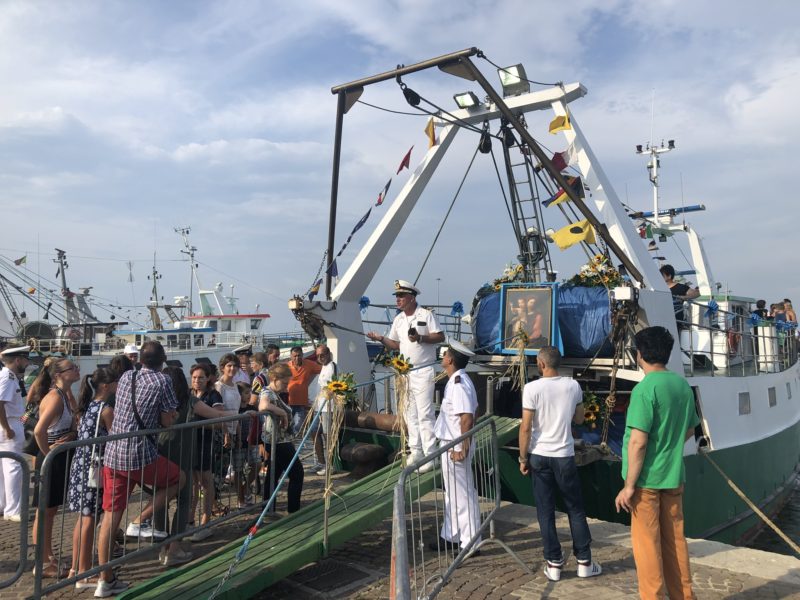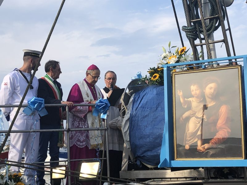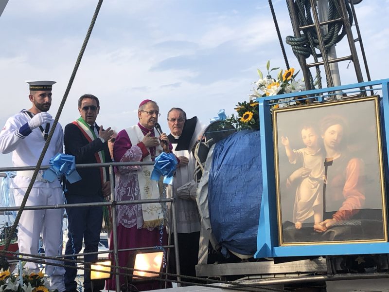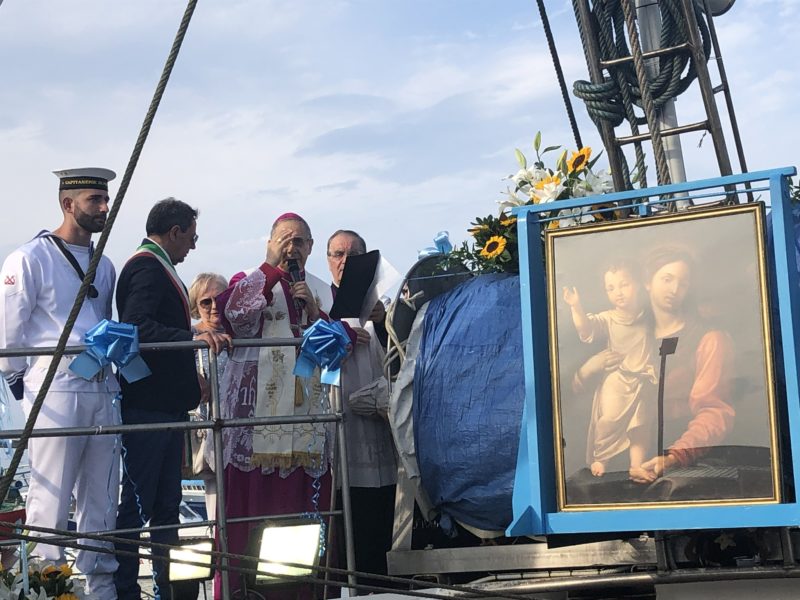 SAN BENEDETTO DEL TRONTO – La festa della Madonna della Marina è giunta a uno dei suoi momenti più suggestivi e significativi: la tradizionale processione in mare con la venerata immagine della Vergine, quest’anno ospitata sull’imbarcazione “Marcantonio II”. Presenti a bordo le autorità religiose, civili e militari della città. Dopo la preghiera recitata dal vescovo Carlo, il “Marcantonio II” è salpato, lasciando il porto accompagnata dallo sguardo dei fedeli e dei turisti assiepati numerosi sulle estremità dei moli e dal fragoroso scoppio dei fuochi d’artificio.