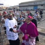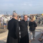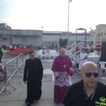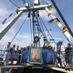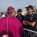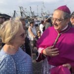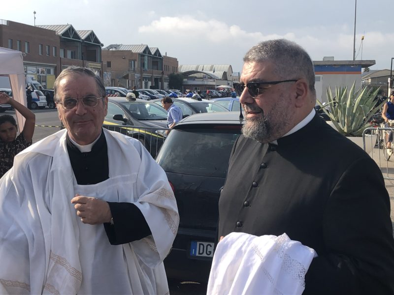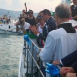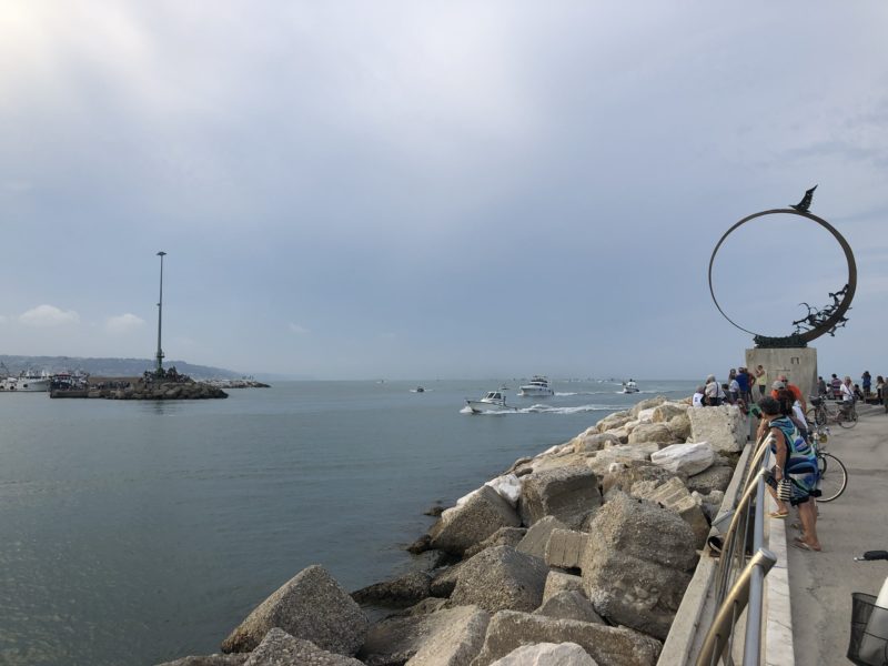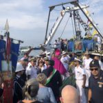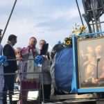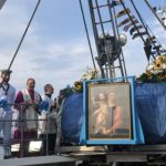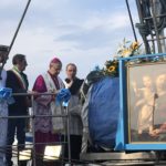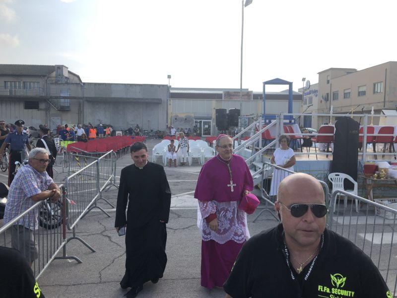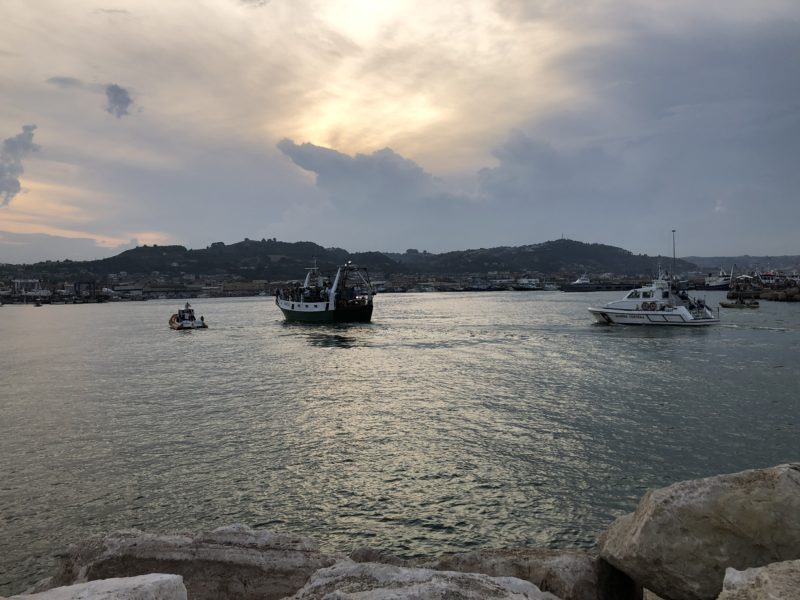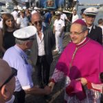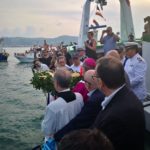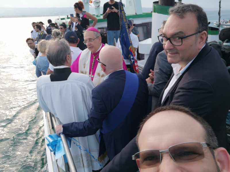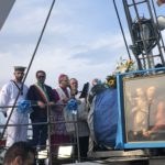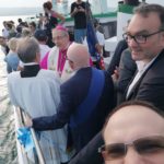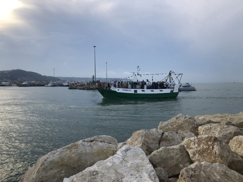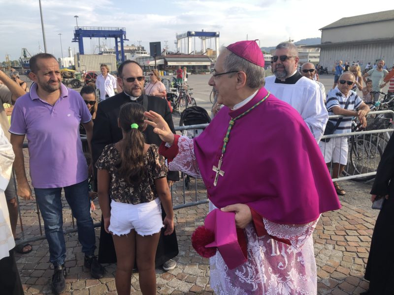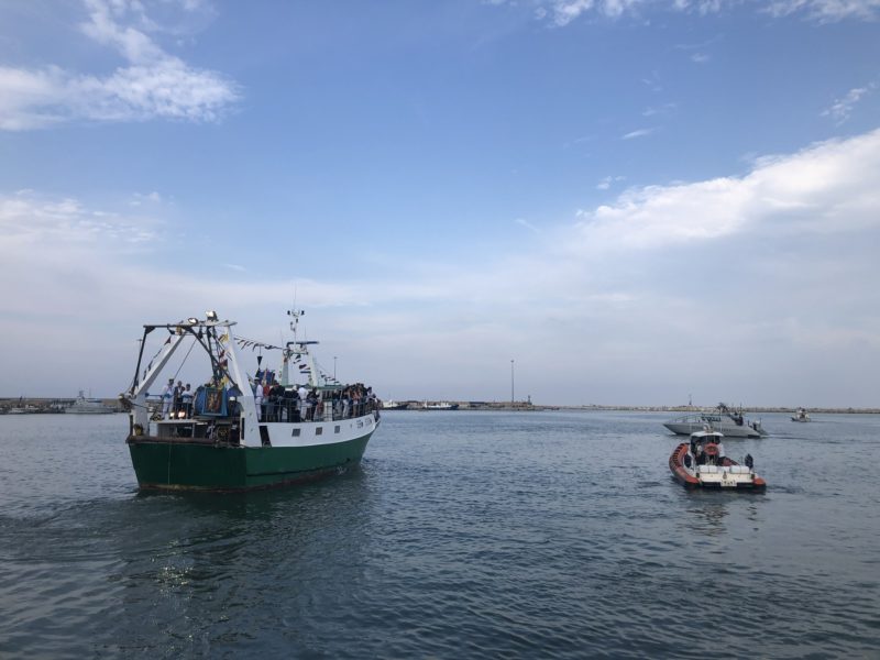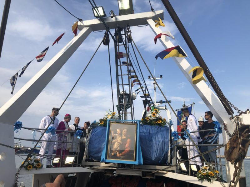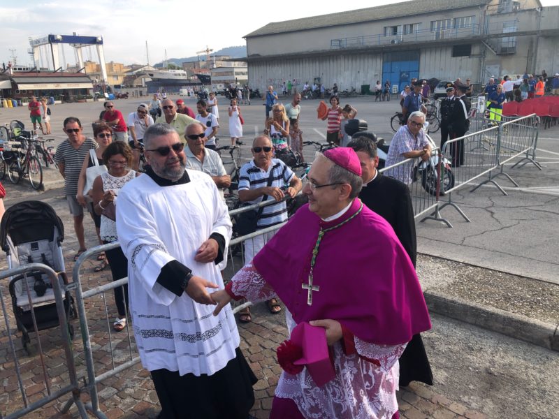 SAN BENEDETTO DEL TRONTO – La festa della Madonna della Marina è giunta a uno dei suoi momenti più suggestivi e significativi: la tradizionale processione in mare con la venerata immagine della Vergine, quest’anno ospitata sull’imbarcazione “Marcantonio II”. Presenti a bordo le autorità religiose, civili e militari della città. Dopo la preghiera recitata dal vescovo Carlo, il “Marcantonio II” è salpato, lasciando il porto accompagnata dallo sguardo dei fedeli e dei turisti assiepati numerosi sulle estremità dei moli e dal fragoroso scoppio dei fuochi d’artificio.