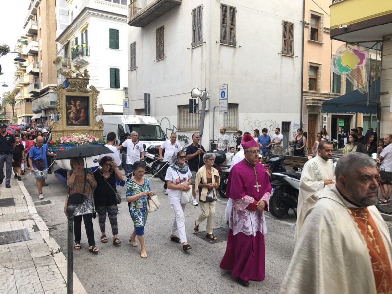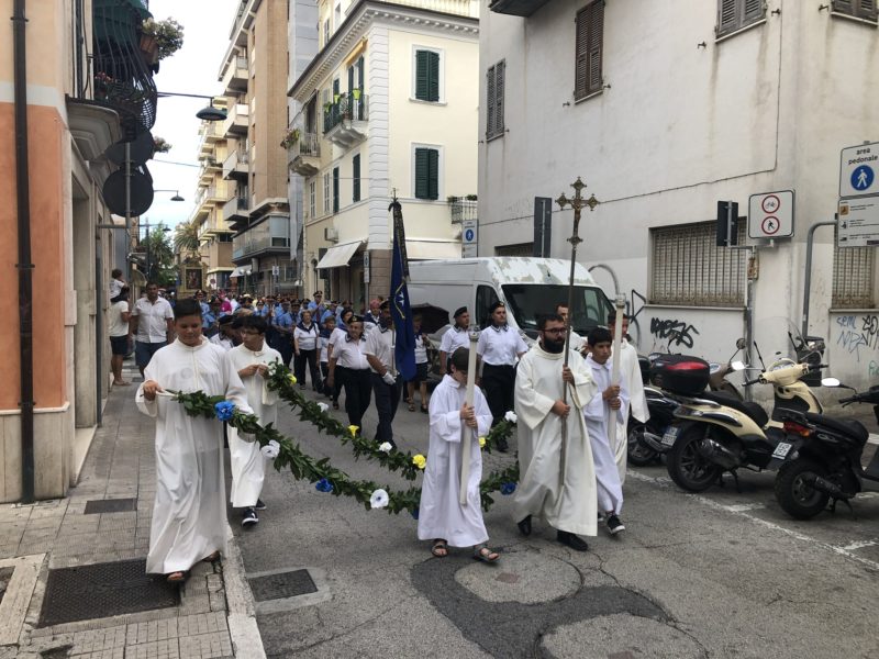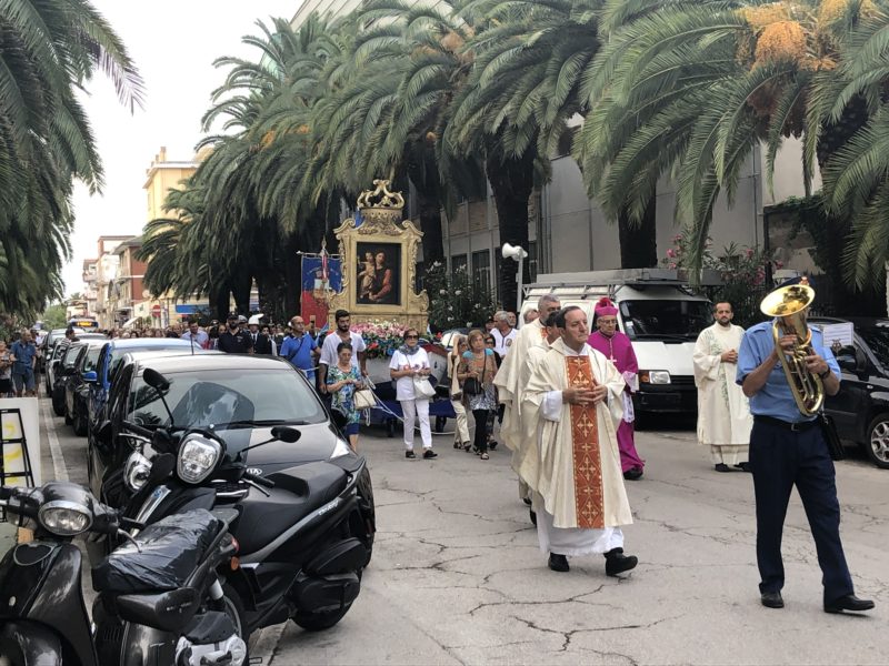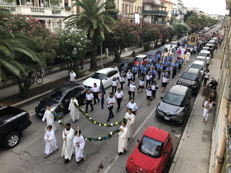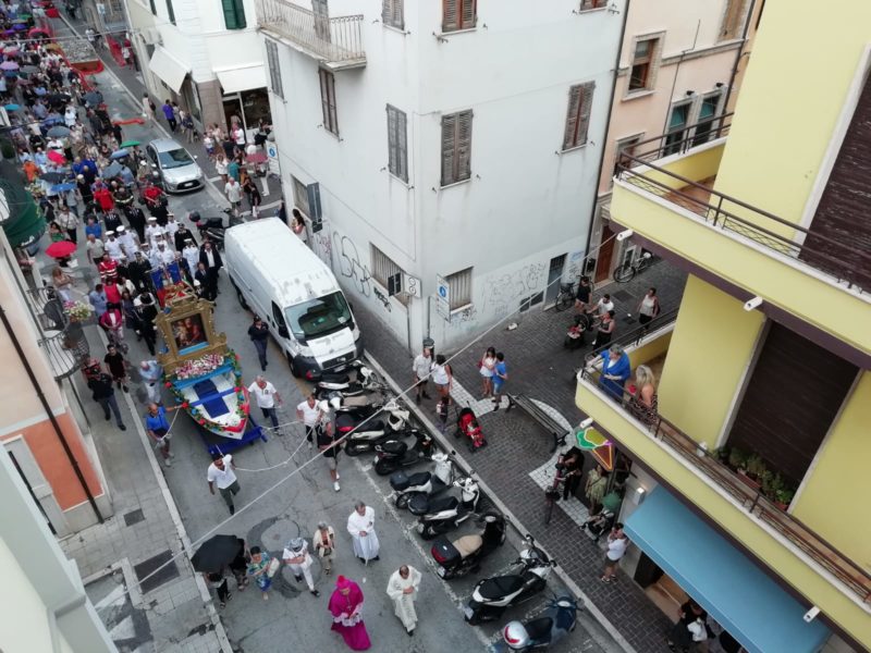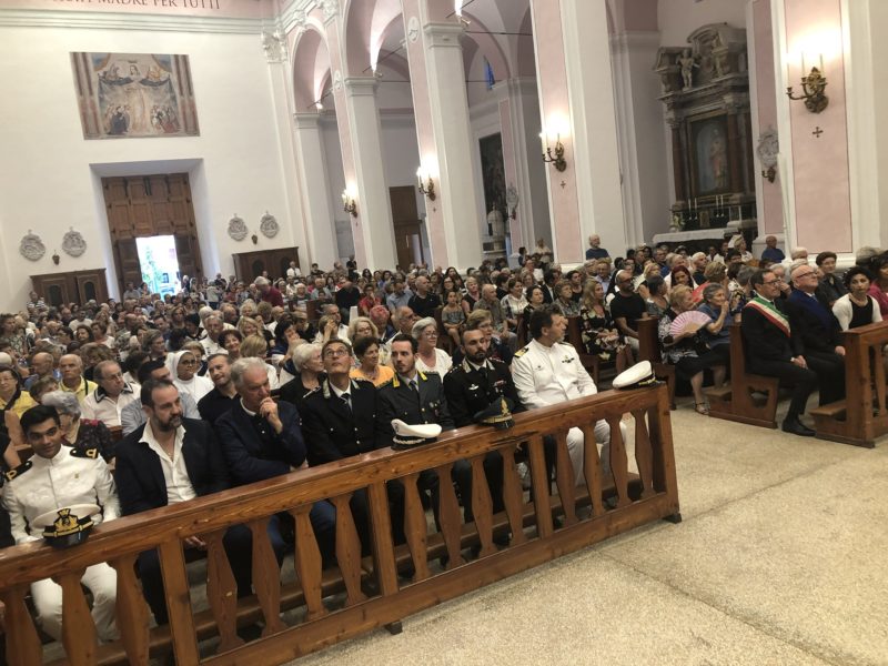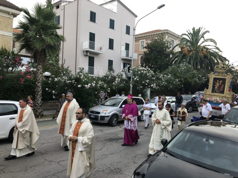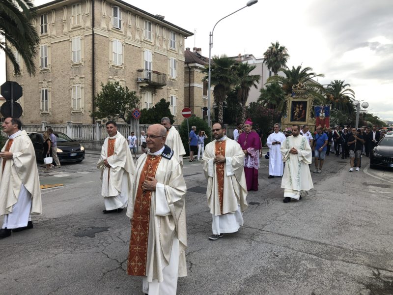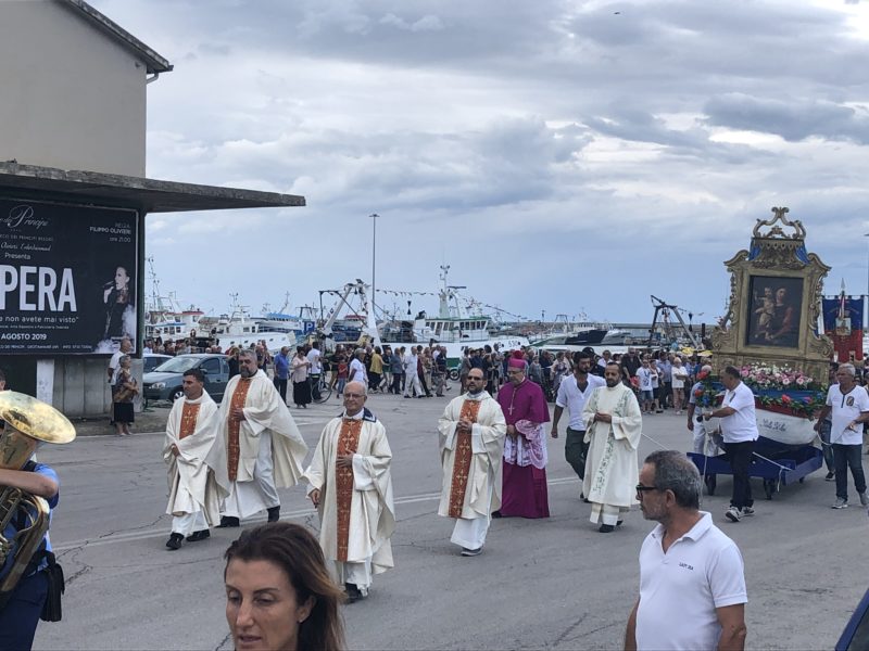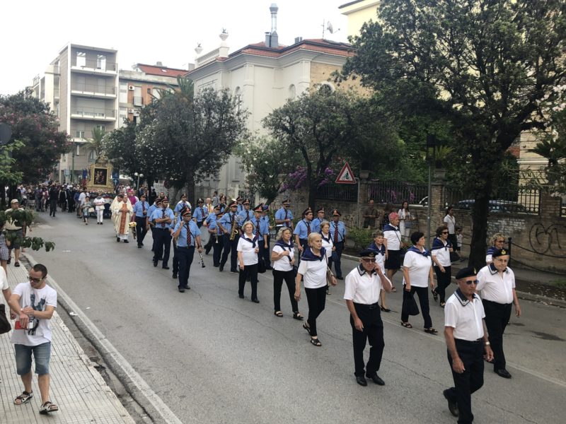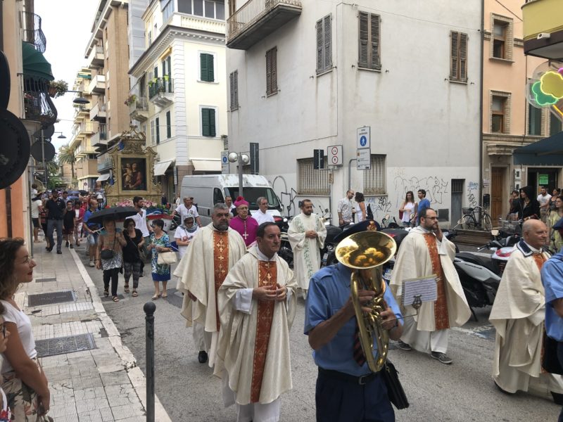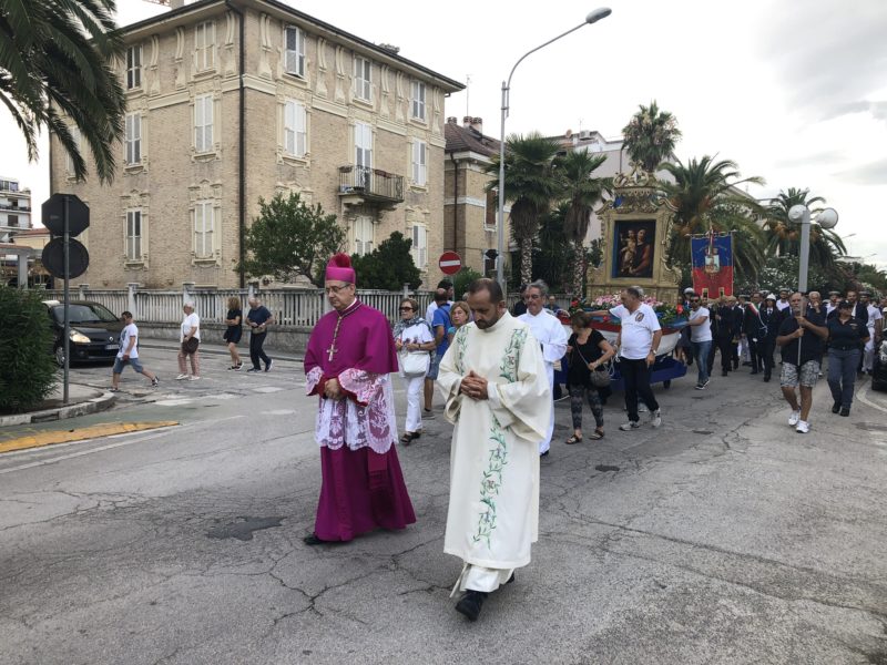 SAN BENEDETTO DEL TRONTO – Domenica 28 luglio con la solenne processione verso la Basilica Cattedrale e la Santa Messa presieduta dal vescovo Carlo Bresciani si è conclusa la festa in onore della Madonna della Marina, Stella del Mare. Il corteo religioso è stato accompagnato dalla Banda Musicale di San Benedetto del Tronto che ha intervallato la recita dei misteri del rosario con brani mariani. Tanti i fedeli, i turisti e i curiosi che si sono fermati lungo le vie Faliero, Colombo, Fiscaletti, Gramsci, Galilei, San Martino e Pizzi al passaggio della venerata immagine della Madonna della Marina, trasportata su uno scafo. A guastare la festa, solo in minima parte per la verità, è stato un modesto rovescio d’acqua che si è riversato sui fedeli e che è iniziato mentre il sacro corteo stava percorrendo via San Martino. Per tale motivo la Santa Messa non è stata celebrata sul sagrato come previsto, ma all’interno della chiesa. Una volta giunti in Cattedrale, ha avuto appunto inizio la Santa Messa, alla quale ha partecipato un gran numero di fedeli, insieme alle autorità civili e militari.