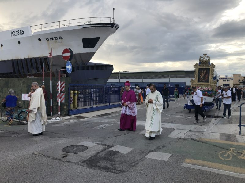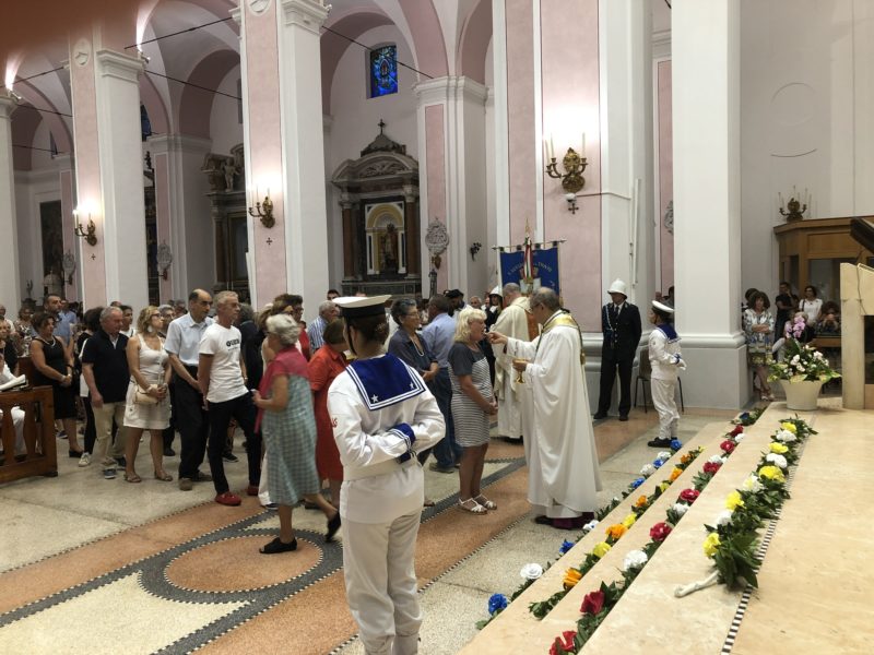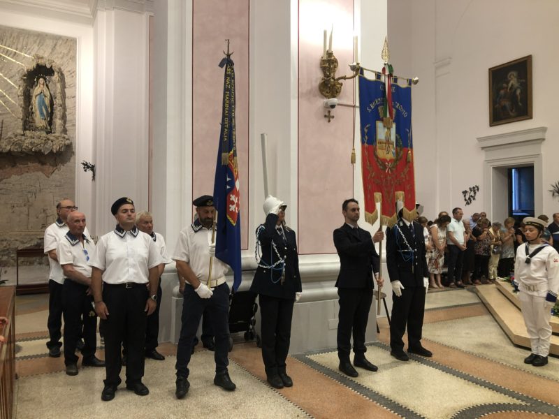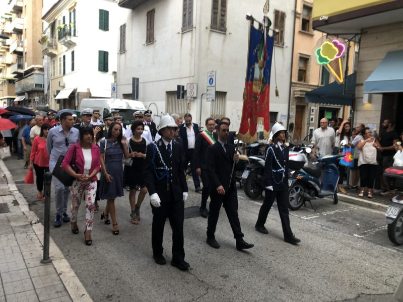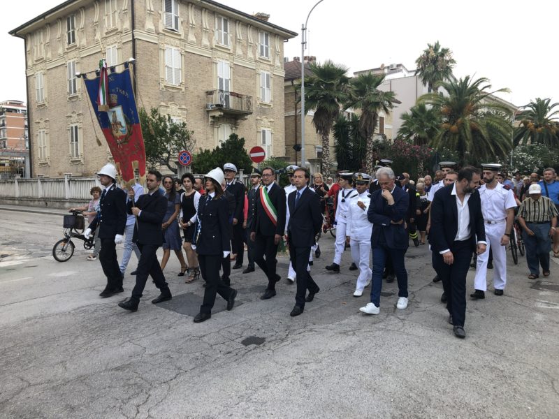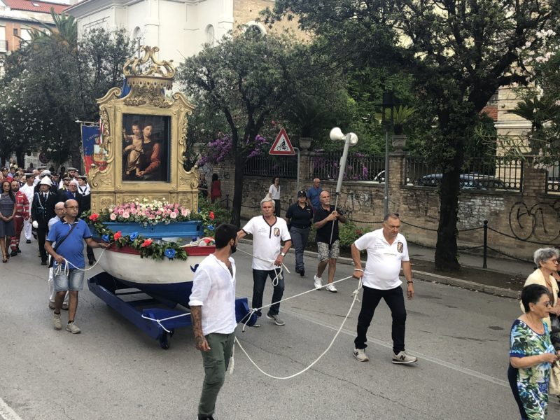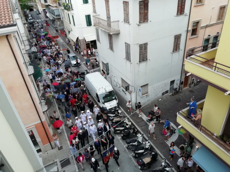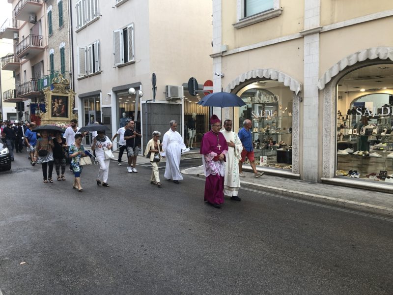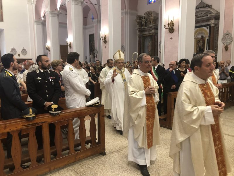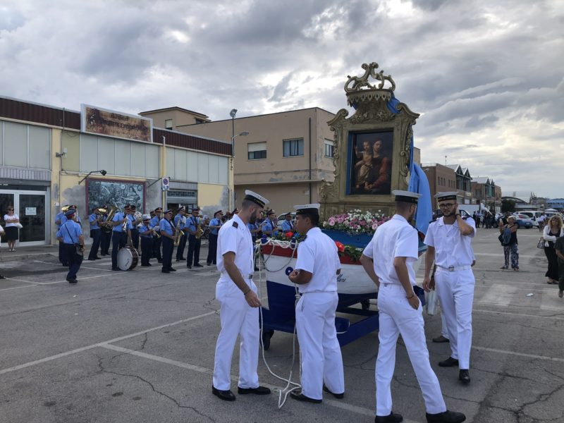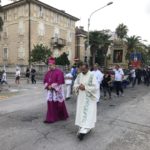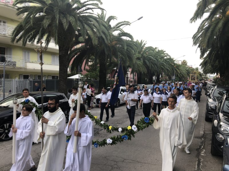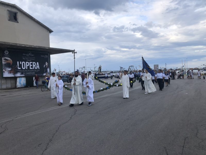 SAN BENEDETTO DEL TRONTO – Domenica 28 luglio con la solenne processione verso la Basilica Cattedrale e la Santa Messa presieduta dal vescovo Carlo Bresciani si è conclusa la festa in onore della Madonna della Marina, Stella del Mare. Il corteo religioso è stato accompagnato dalla Banda Musicale di San Benedetto del Tronto che ha intervallato la recita dei misteri del rosario con brani mariani. Tanti i fedeli, i turisti e i curiosi che si sono fermati lungo le vie Faliero, Colombo, Fiscaletti, Gramsci, Galilei, San Martino e Pizzi al passaggio della venerata immagine della Madonna della Marina, trasportata su uno scafo. A guastare la festa, solo in minima parte per la verità, è stato un modesto rovescio d’acqua che si è riversato sui fedeli e che è iniziato mentre il sacro corteo stava percorrendo via San Martino. Per tale motivo la Santa Messa non è stata celebrata sul sagrato come previsto, ma all’interno della chiesa. Una volta giunti in Cattedrale, ha avuto appunto inizio la Santa Messa, alla quale ha partecipato un gran numero di fedeli, insieme alle autorità civili e militari.